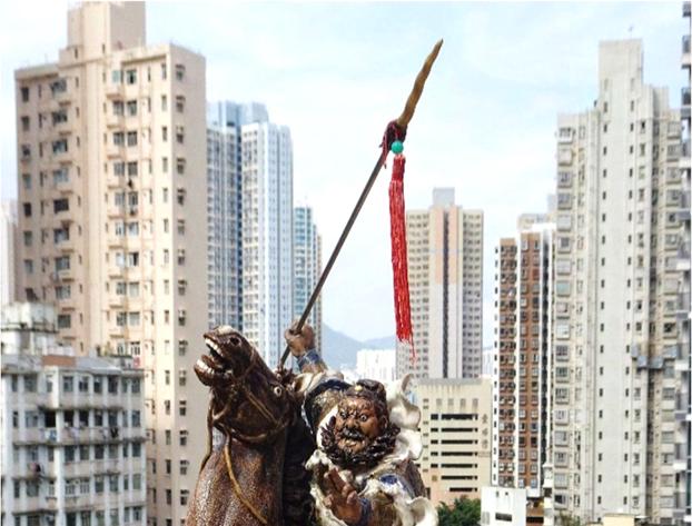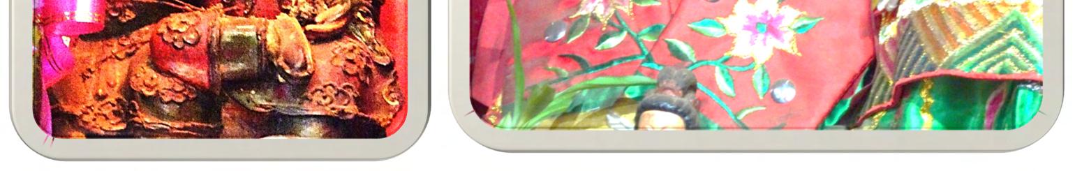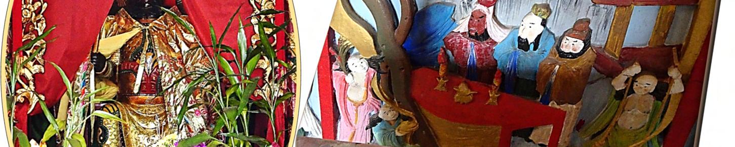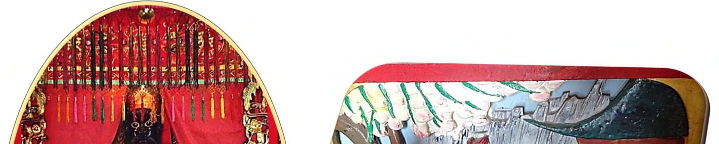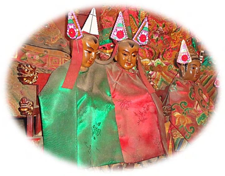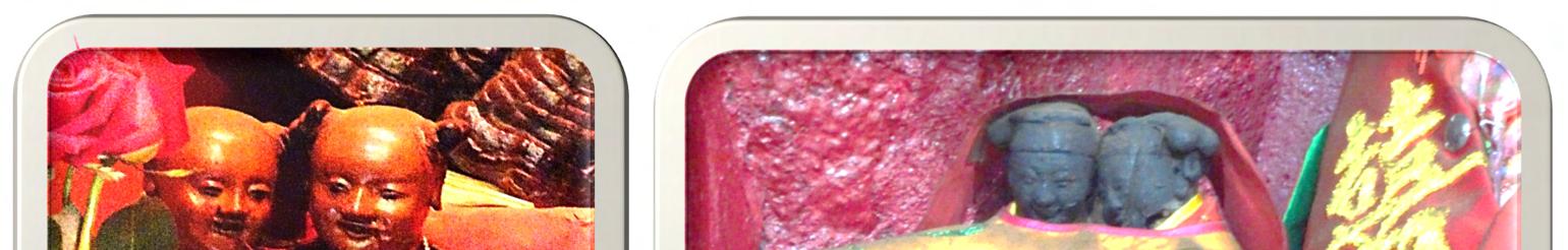 寒山手棒圓盒,盒上有一隻蝙蝠代表「福到」之意,拾 得手持荷花。 上環文武廟神像(圖八) 二仙神像分別用綠布及紅布包裹著。 灣仔玉虛宮神像(圖九) 二仙神像作華麗打扮,佩戴珠鏈,其中一個把腳翹起, 膝蓋搭在對方的膝蓋上,十分親暱。 灣仔洪聖廟神像(圖十) 二仙神像呈黑色,蓋上一幅金紅色喜慶服飾。 四