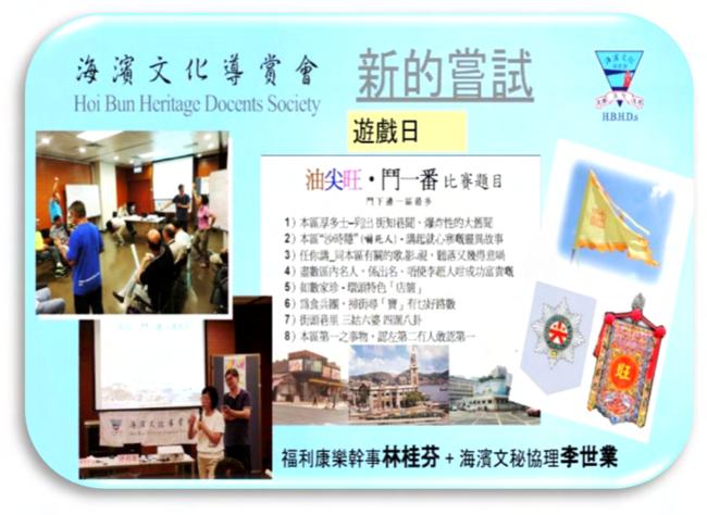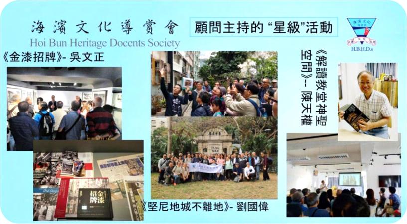 本會是"導賞員之家,熱心人基地",我們自覺地聚焦在普及型活 動方面做貢獻,自成立以來,經常舉辨文化、史蹟、生態的會員活 動,更創造了自習互教的嶄新導賞活動方式,讓會員互動參予,發 掘出被遺忘的史料和第一身故事。又與多個知名團體合辦公眾導賞 團,本會負責所有的行程策劃與導賞工作,經由他們向公眾推廣。 還多次協助長者服務團體,主辦系列講座或培訓班,歸納出社區街 坊的微歷史;培訓街坊長者作為本區文史導賞員,傳承社區文化。 本會還不時舉行境外文史深度遊,既享旅遊樂趣,同時不忘深