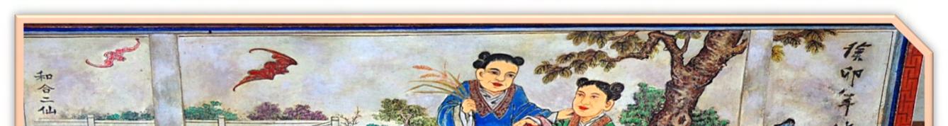 ~ ~~~~~~~~~~~~~~~~~~~~~~~~~~~~~海濱文圃第九期~~~~~~~~~~~~~~~~ ~~~~~~~~~~~~~~ 7 「和合二仙」- 兩位孩童模樣的喜神 徐佩君 中國民間神話中,「和合二仙」這一對喜 神,原本寓意友情與兄弟和睦共處,後引伸婚 姻美滿,家庭和諧,是香港古建築常見的人 物裝飾題材 (注 1)。昔日上環文武廟在廟外 設置「桃花亭」,讓善信在粉紅色的桃花絲帶 上寫上心願,並繫在旁邊的桃花樹上求取姻 緣,而在「桃花亭」旁邊,則放置了從廟內 請出來的「和合二仙」神像讓人