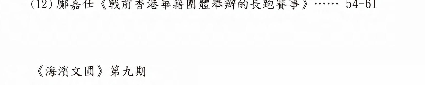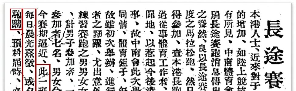 ~~~~~~~~~~~~~~~~~~~~~~~~~~~~~海濱文圃第九期~~~~~~~~~~~~~~~~~~~~~~~~~~~~~~~~~~ 56 工 放 學 後, 結 伴一起 練 習 ,如 果讀 者是 跑友 的 話,自能心神領會: … 此 一 班 神 行 太 保、無不於每日晨光熹 微,或夕陽斜暉之際, 共作馳騁 … 《香港工商 日報,1935 年 2月26 日》[圖 2] 到比賽舉行當天,中南體育會在下午 1 時 30 分開始儀式,由香港體育協進會 的執行委員長顏成坤先生發司號令,在 1 時 50 分先讓女參加者先行出發,2 時正 才讓男參加者出發,這個早出