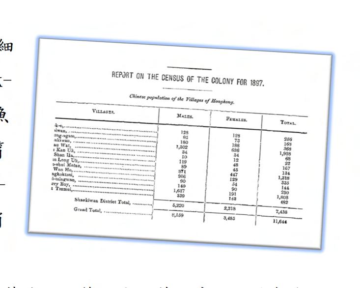 一八九七年的人口普查報告,將各區再細 分成更小區以公佈人口(圖一),當中的Sheko(石澳)、Chaiwan(柴灣)、Quarry Bay(鰂魚 涌)、Tsat Tszmui(七姊妹),現今已不屬筲 箕灣區,而Wongkoktsui(黃角嘴)及Shuitsingwan(水井灣)於一九零七年報告開始消 失,因為已變成太古船塢。