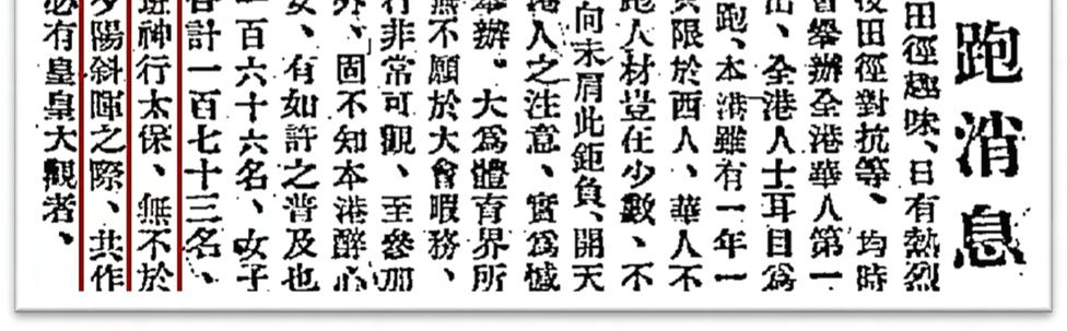 不能參與。長跑賽事定於同年 3 月2 日下午舉行,而除了舉辦方中南體育會是華 人體育組織外,亦有邀請基督教青年會、南華會及女青年會的不同分會協辦,可 見當時中南體育會希望組織一個具代表性的長跑比賽讓華人參與。 其後各報陸續披露更多的籌辦詳情。比賽路線由中南體育會門前 (堅道 73 號) 出發,往東走亞畢諾道、花園遁、大道東 (現皇后大道東),靠當時的海邊走軍 器廠 (現警察總部)、告羅士打道 (現告士打道)、在波斯富街轉入軒彌詩道 (現 軒尼詩道),以頤和