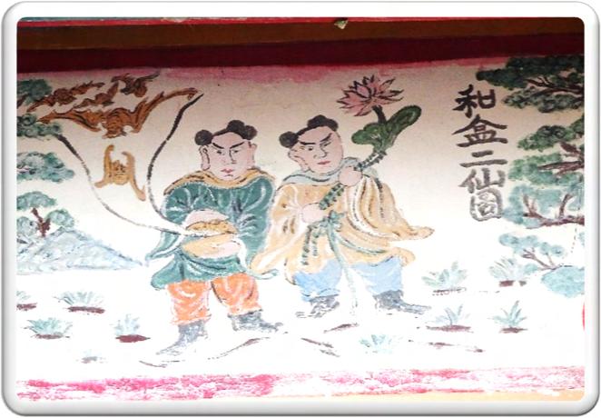 ~ ~~~~~~~~~~~~~~~~~~~~~~~~~~~~~海濱文圃第九期~~~~~~~~~~~~~~~~ ~~~~~~~~~~~~~~ 9 型,源於以下故事 : 寒山與拾得住在北方一個村子裏,二人感情非常深厚,寒 山年紀稍長,不知道與拾得愛上同一個姑娘,到了拾得和那位姑娘結婚時,寒山 才得知。寒山於是棄家到江南蘇州楓橋,削髮為僧。拾得得知後,便丟下未婚妻 去尋找寒山,得知寒山的住處後,拾得乃折了一朵盛開的荷花前去探訪,而寒山 見拾得前來,連忙捧着盛上齋飯的盒子出迎,二人高興之極,拾得也隨後出了家, 姑蘇城外的寒山寺便是二人修成正果之處。二仙分別手持「盒」與「荷」,乃同 「和」、「合」諧音,即取「和合」之意。 2006 年大埔泰亨鄉天后廟附近的一棵連理樹下,有人建了一間和合二仙神龕, 這可是全港獨一無二的合廟。現試看看本地廟宇中「和合二仙」孩童造型的裝飾 及神像 : 元朗屏山洪聖宮