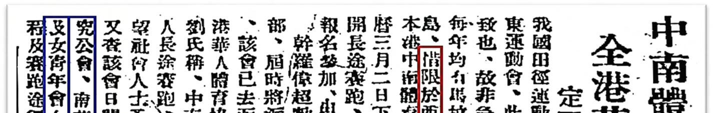 體育會就著中國三江的水災災情嚴重,在利園舉辦園遊會籌款, 籌得超過2,000元,全數轉交東華醫院。可見體育會除了推廣運動的功能,亦有 聯繫不同人士,及提供社會服務的作用。在1934年開始,中南體育會已開始舉 辦大型的田徑比賽,以當年的「省港澳記者陸上運動會」為例,延續體育會過去 為省港澳記者水運會的模式舉行,比賽項目計有跳高、跳遠、持竿跳,擲鏈球、 鐵餅、標槍,以及 100、200、400、800、1,000、10,000公尺和400 米 4人接力 賽跑等,可見已是現代化的比賽及規模。 根據1935 年1月15 日,香港工商日報報導 [圖 1],中南體育會擬舉辦開放 予華人參與的長跑賽事,報載的原因是過往所舉辦的長跑賽事,只限西人而華人