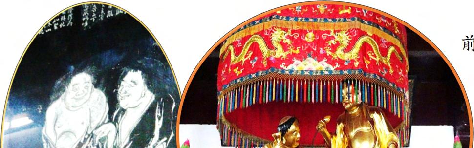 供奉(圖一)。 相傳「和合二仙」是唐貞觀年間寒山和拾得兩位僧人。明人洪應明《仙佛奇 蹤˙卷七》記載寒山沒有姓氏,曾住在始豐縣天臺山的寒岩中,遂名寒山。寒山 容貌乾枯憔悴,身穿破衣爛衫,頭戴樺樹皮帽,腳踏大號木屐。餓了就到國清寺 撿拾寺僧吃剩的飯菜。有時走到寺院的廊下,大聲喊叫,望空漫駡。寺僧忍無可 忍,拿着棍棒來驅趕他,他則拊掌大笑揚長而去。寒山在國清寺當過繞火和尚, 後來,他縮身岩石縫中,只說 :「你們大家努力吧 !」石縫忽然而合,杳無蹤踪。 至於拾得本是一名孤兒,他被豐干禪師從路上撿拾回