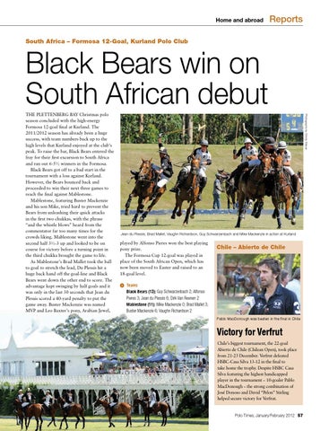 Victory for Verfrut Chile’s biggest tournament, the 22-goal Abierto de Chile (Chilean Open), took place from 21-23 December. Verfrut defeated HSBC-Casa Silva 13-12 in the final to take home the trophy. Despite HSBC Casa Silva featuring the highest handicapped player in the tournament – 10-goaler Pablo MacDonough – the strong combination of José Donoso and David “Pelon” Stirling helped secure victory for Verfrut. Polo Times, January/February 2012 57