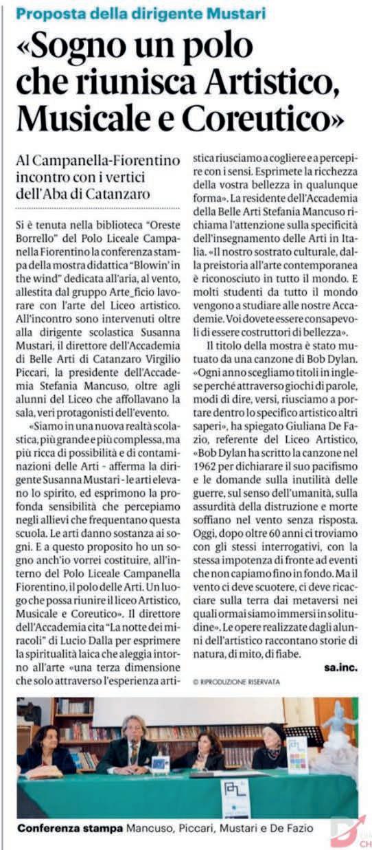Giorno 11 febbraio si è tenuta nella Biblioteca Oreste Borrello del Polo Liceale “Campanella Fiorentino” la conferenza stampa della mostra didattica Blowin’ in the wind dedicata all’aria e al vento, allestita dal gruppo Arte_ficio lavorare con l’arte del Liceo Artistico. All’incontro sono intervenuti oltre alla Dirigente scolastica Dott.ssa Susanna Mustari, che ha salutato e ringraziato i convenuti, il Direttore dell’Accademia di Belle Arti di Catanzaro Prof. Arch. Virgilio Piccari, la Presidente dell’Accademia Prof.ssa Stefania Mancuso, oltre agli alunni del Liceo che affollavano la sala, veri protagonisti dell’evento.