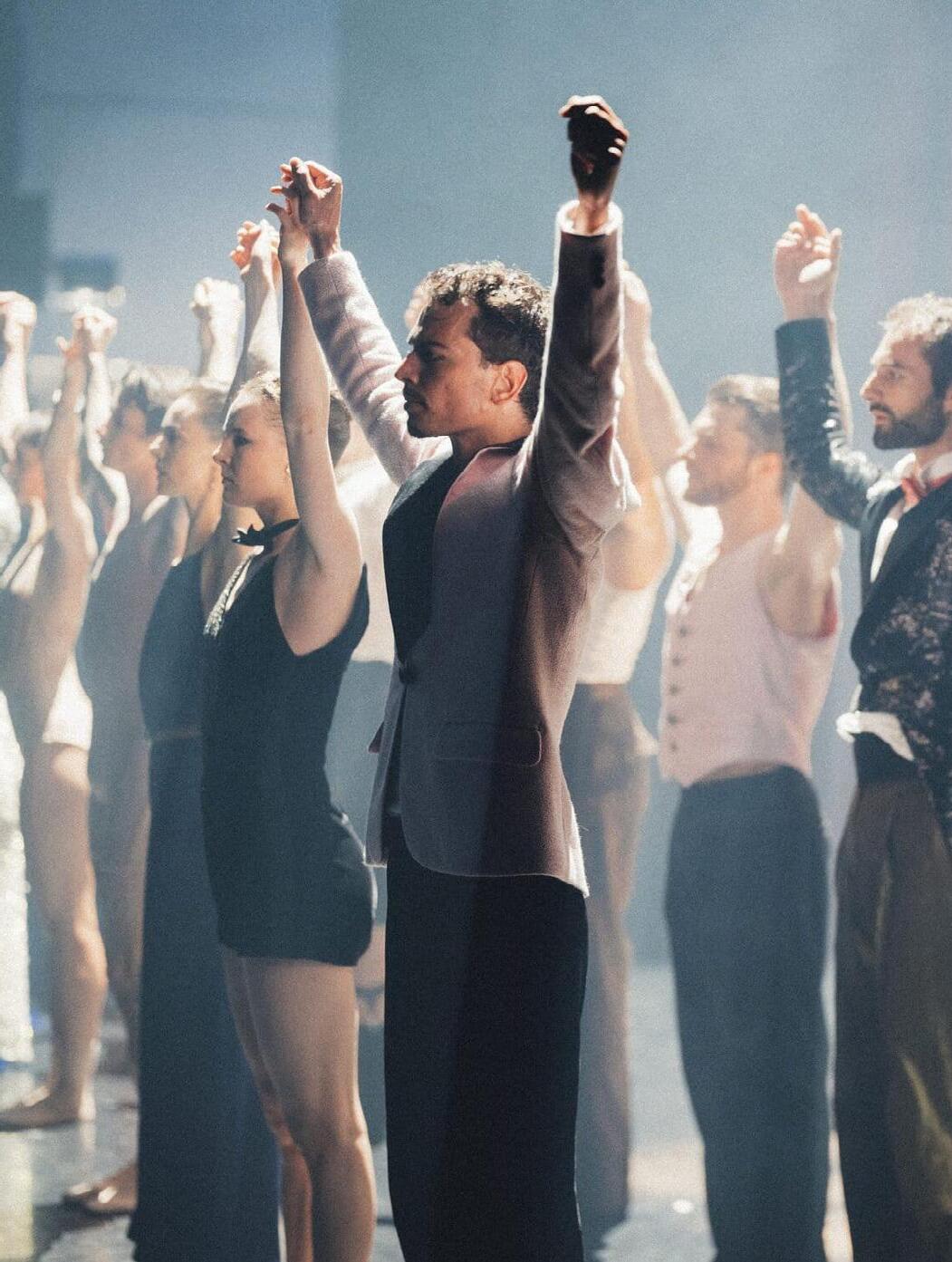 Shechter’s visceral and dynamic choreography into a theatrical cabaret setting, complete with red velvet curtains, live music, and a charged atmosphere of dark glamour. Thirteen dancers—six women and seven men—inhabit a stage that shifts between festive spectacle and physical intensity, accompanied by a four-piece band.