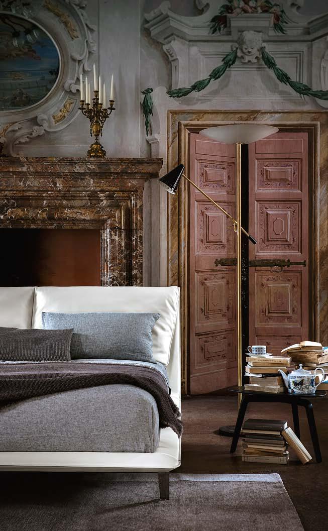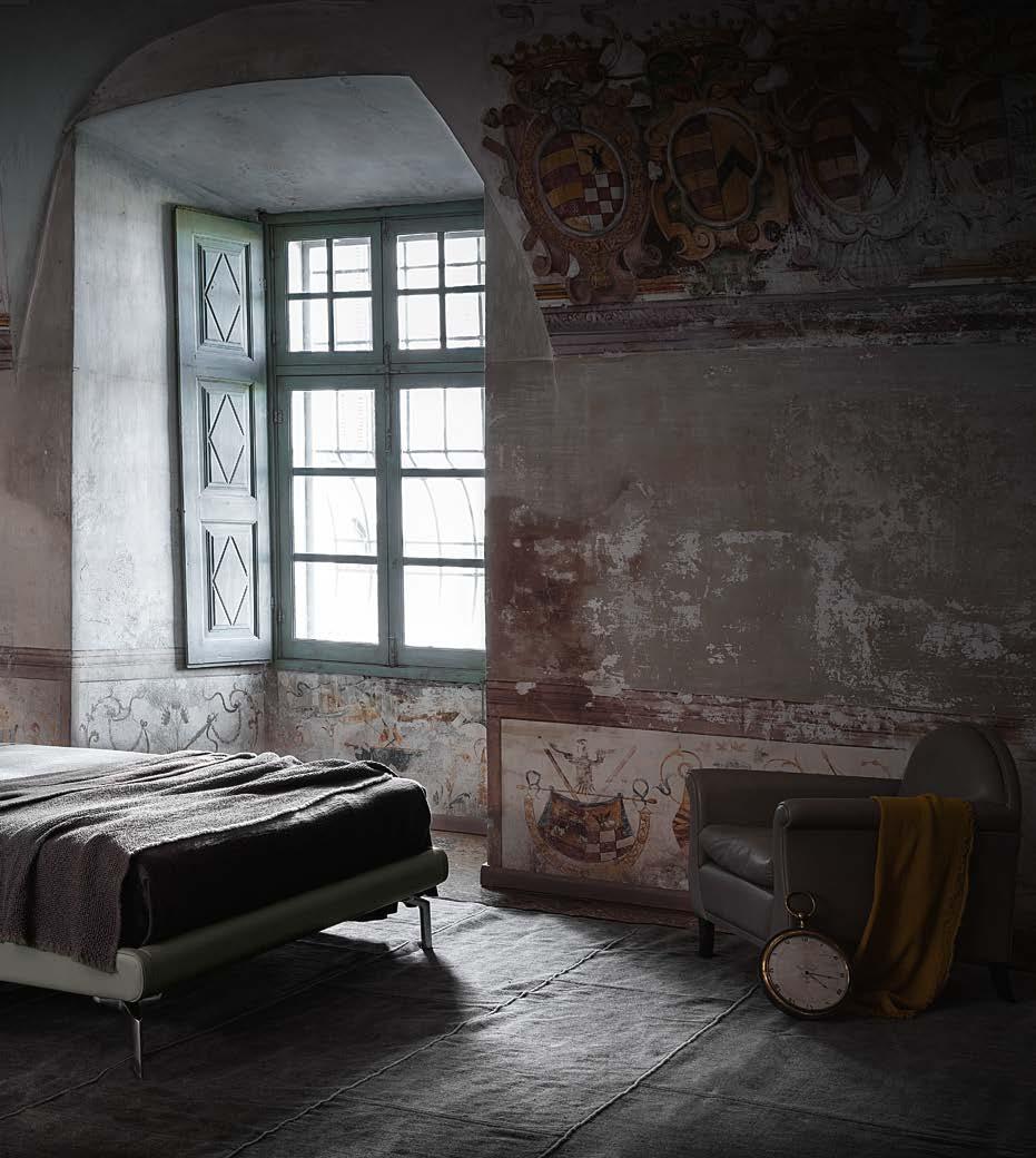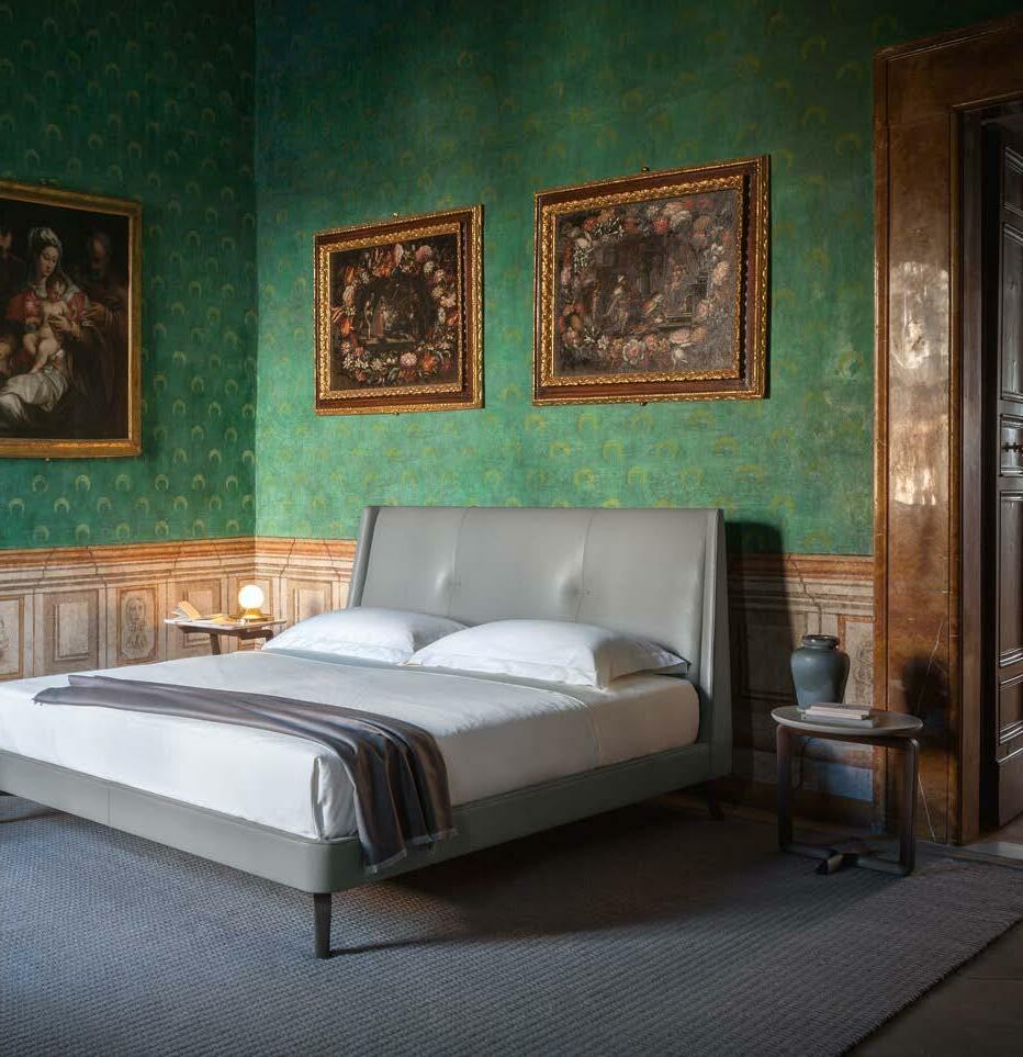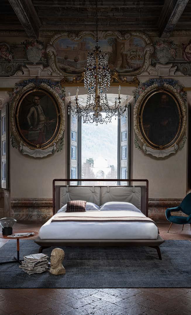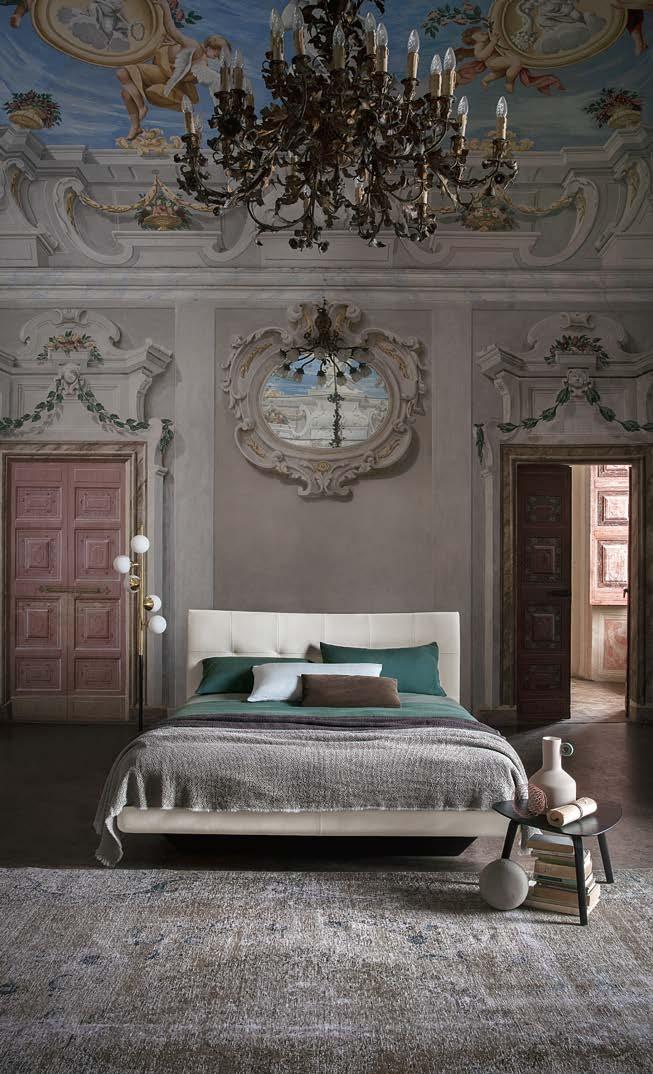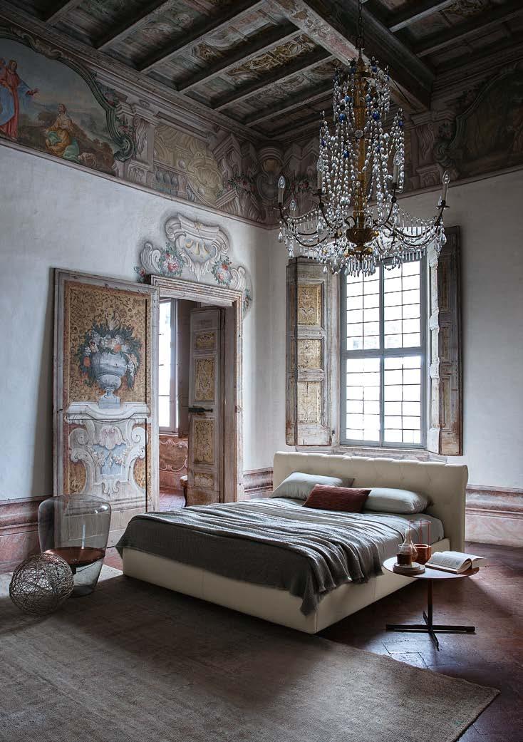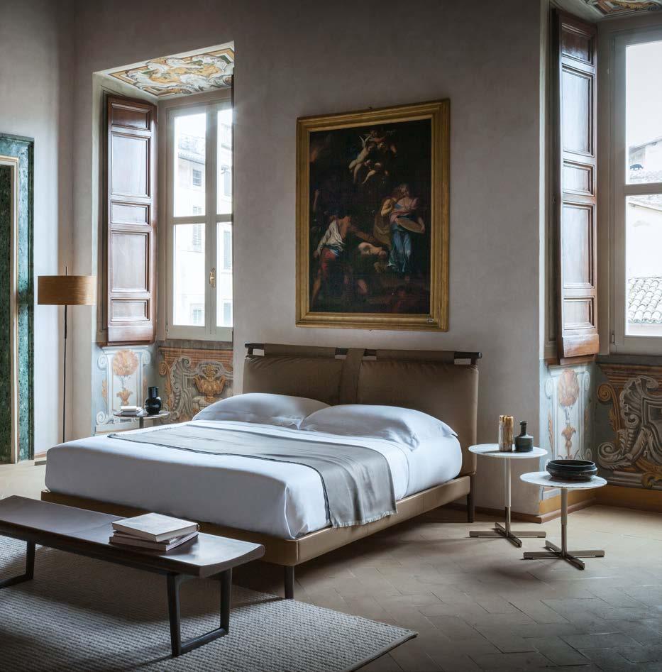 Di stanza in stanza affiora una storia di arte e di magia, che si svela pie namente nella prima luce del mattino. Le quinte profonde di una grande fi nestra. Un affresco prezioso e i suoi colori voluttuosi. Il gioco di pieni e vuoti di un’antica boiserie. E poi forme disegnate per accogliere il sonno con naturale eleganza. La pelle lavorata da artigiani che ne conoscono tutti i segreti. Il cuoio e i tessuti. Il legno e l’acciaio. Soffici piume e raffinate cro mie. Il letto come architettura e nido. Come incontro calibrato fra design contemporaneo e tradizione.