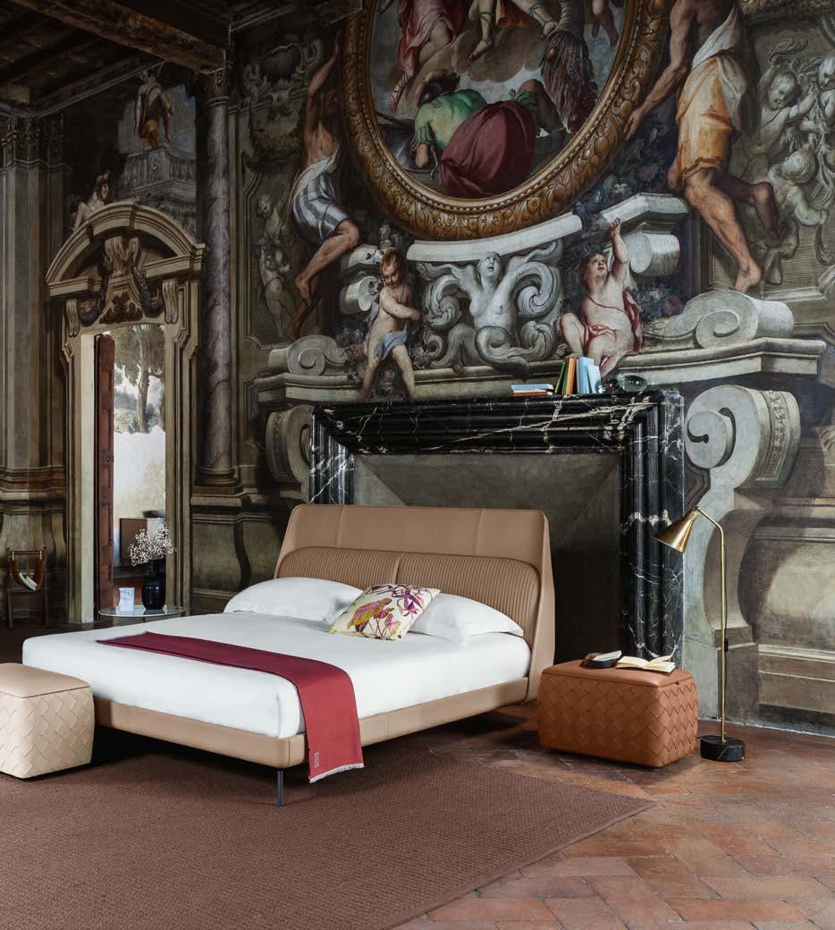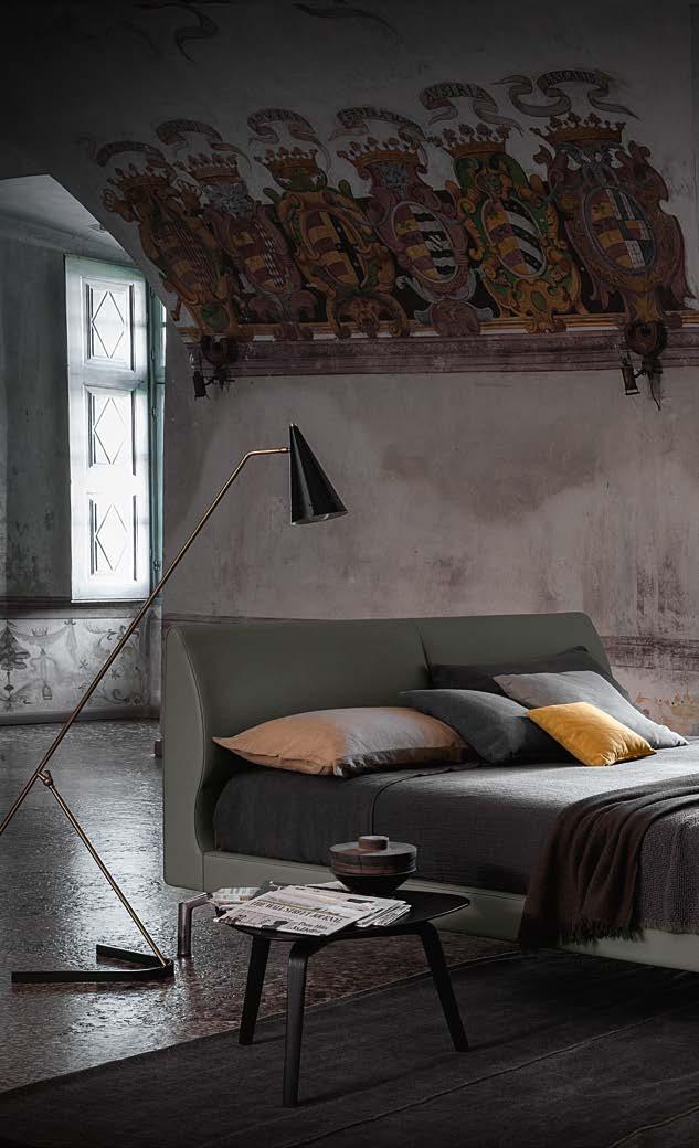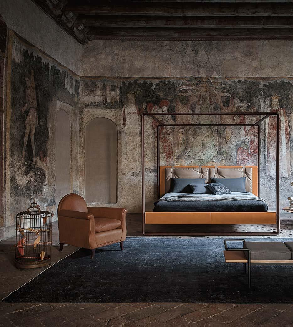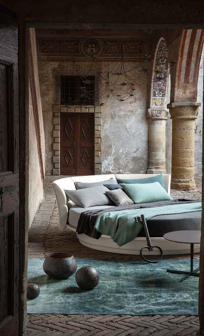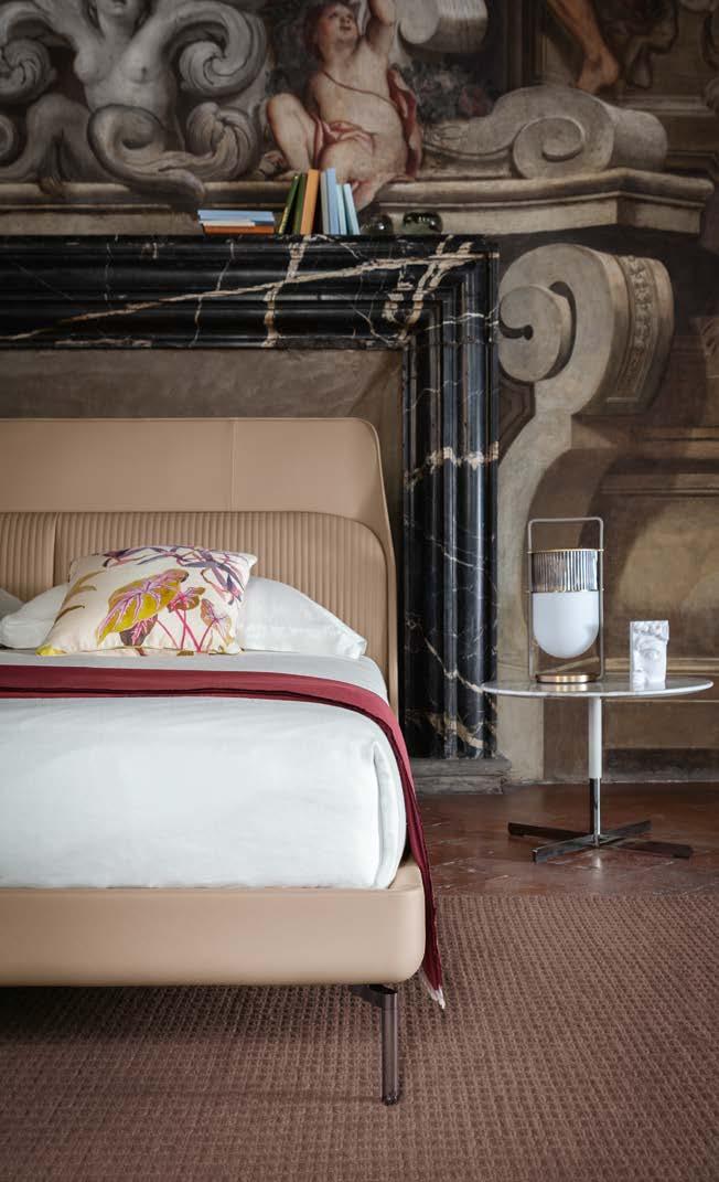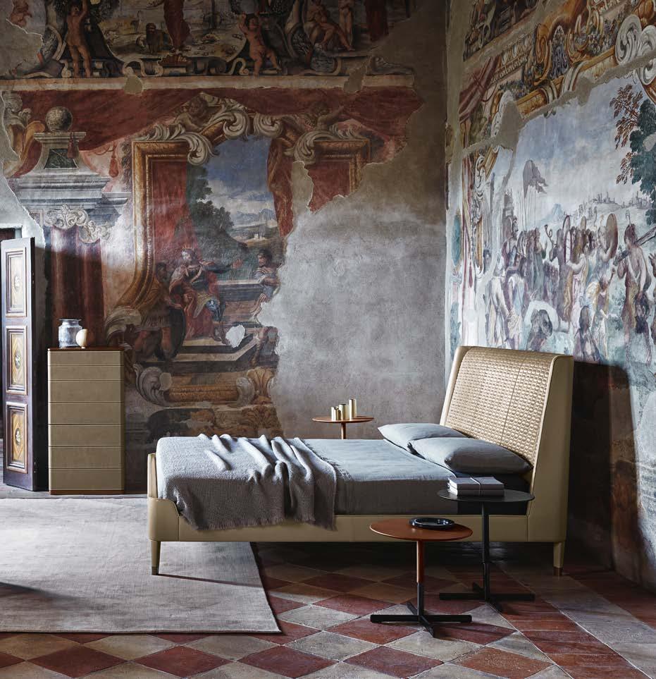 Di stanza in stanza affiora una storia di arte e di magia, che si svela pie namente nella prima luce del mattino. Le quinte profonde di una grande fi nestra. Un affresco prezioso e i suoi colori voluttuosi. Il gioco di pieni e vuoti di un’antica boiserie. E poi forme disegnate per accogliere il sonno con naturale eleganza. La pelle lavorata da artigiani che ne conoscono tutti i segreti. Il cuoio e i tessuti. Il legno e l’acciaio. Soffici piume e raffinate cro mie. Il letto come architettura e nido. Come incontro calibrato fra design contemporaneo e tradizione.