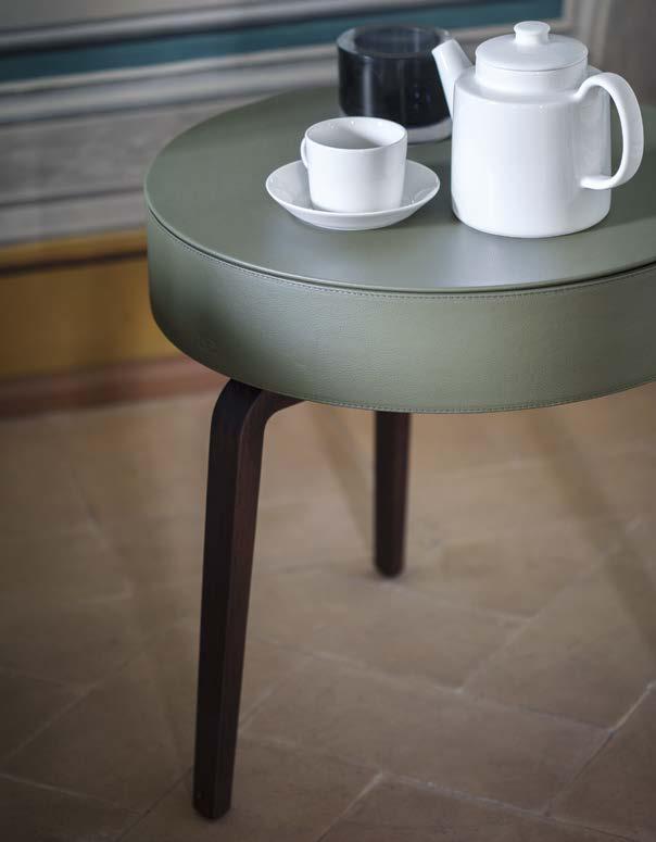 ↑ Vanity Fair XC, Pelle Frau® SC 175 Bengali Green ↑ Vanity Fair XC ottoman with stotage, Pelle Frau® SC 175 Bengali Green ↗ Mi low cabinet, Saddle Extra Cammello with Calacatta marble top ↗ Xi table lamp, Zaffiro glass with Saddle Extra Talpa band