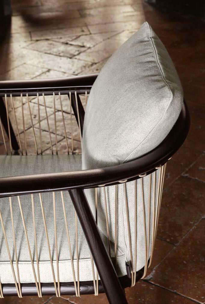 ↗ Viola small armchairs, Fabric Guatemala Ecrù with natural leather rope and moka ash structure