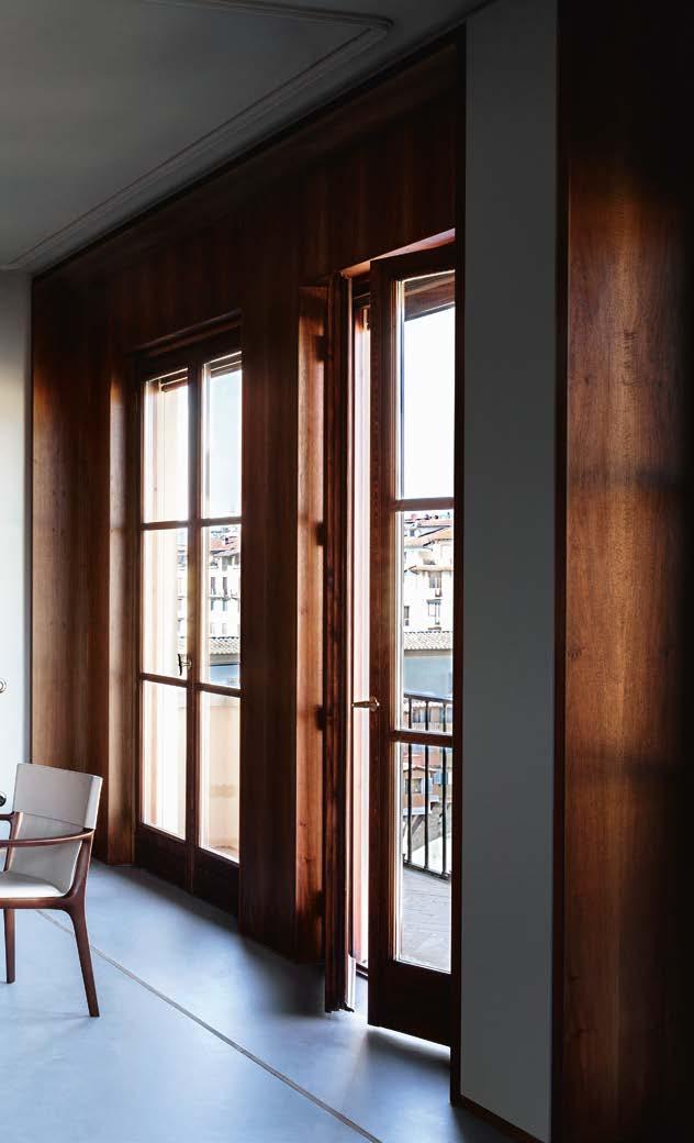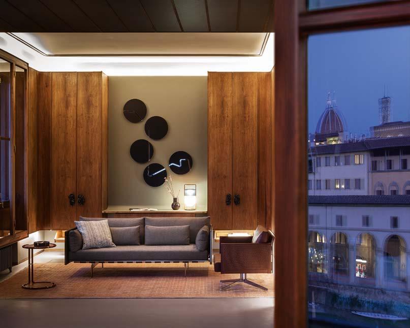 Room after room tells a story of art and magic, which is fully revealed in the first light of dawn. The deep recesses of a large window. A pre cious fresco of sumptuous colours. The interplay between solids and voids in ancient wood panelling. And then, shapes designed to welcome sleep with natural elegance. Leather worked by artisans who know all of its secrets. The leather and the fabrics. The wood and the steel. Soft feathers and refined colours. The bed which is both architecture and nest. A calcu lated melding of contemporary design and tradition.