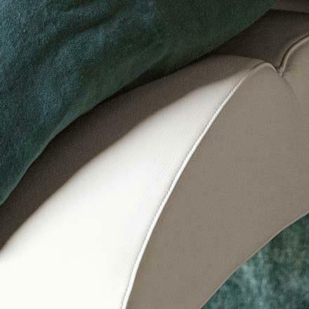 Leather and fabric: overlapping and combinations of soft surfaces. This bed from the Poltrona Frau collection features decorative elements and offers practicality and comfort. A fabric cover is fixed to the leather headboard with double braiding.