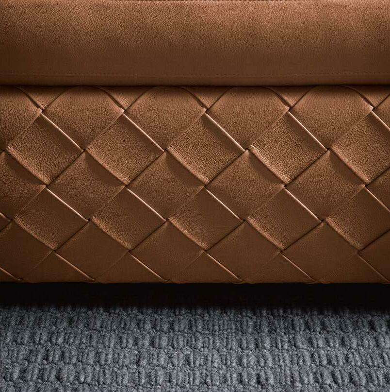 Poltrona Frau designs a bed that recalls the ample, generous geometries of the Massimosistema sofa. A play on overlays that feature on the back and cushions. Upholstery is in Pelle Frau® leather enhanced by beautiful quilted stitching.