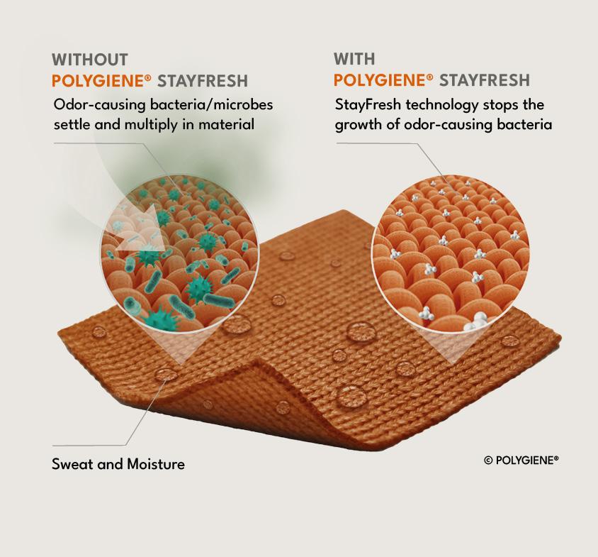 Polygiene StayFresh inhibits the growth of odor-causing bacteria, stopping smells at the source.