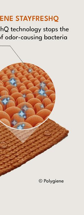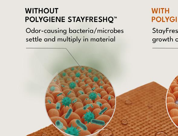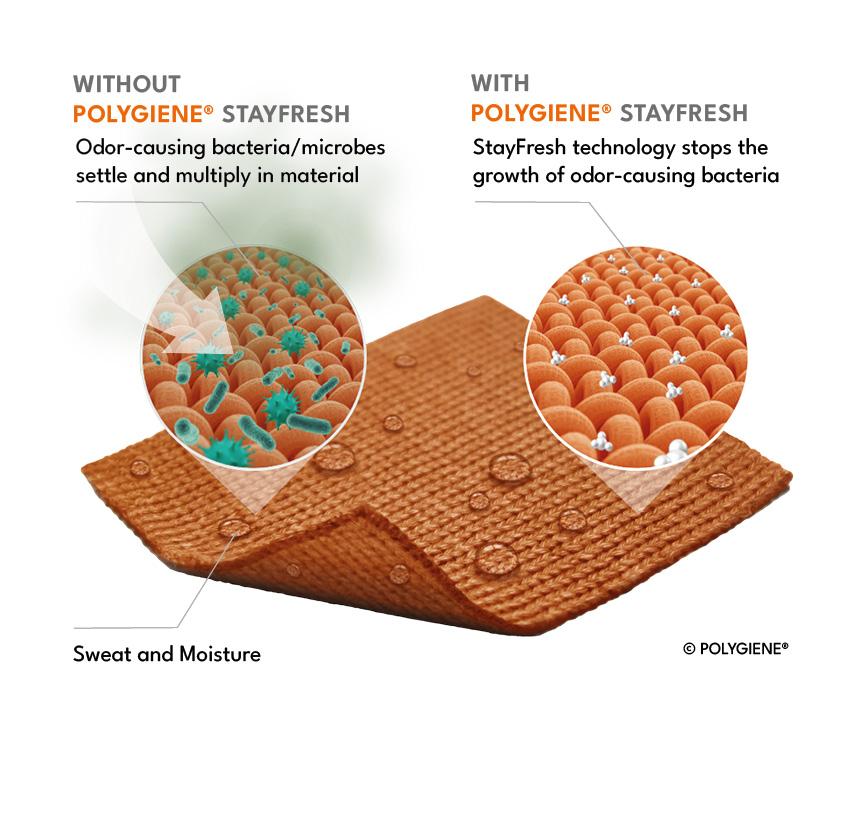 Polygiene StayFreshQ is a nonmetal, invisible, industry-leading odor control technology that keeps textiles fresher for longer, enhancing the user experience while helping to reduce the need for frequent washing, which contributes to lower water and energy use over the lifespan of the product.