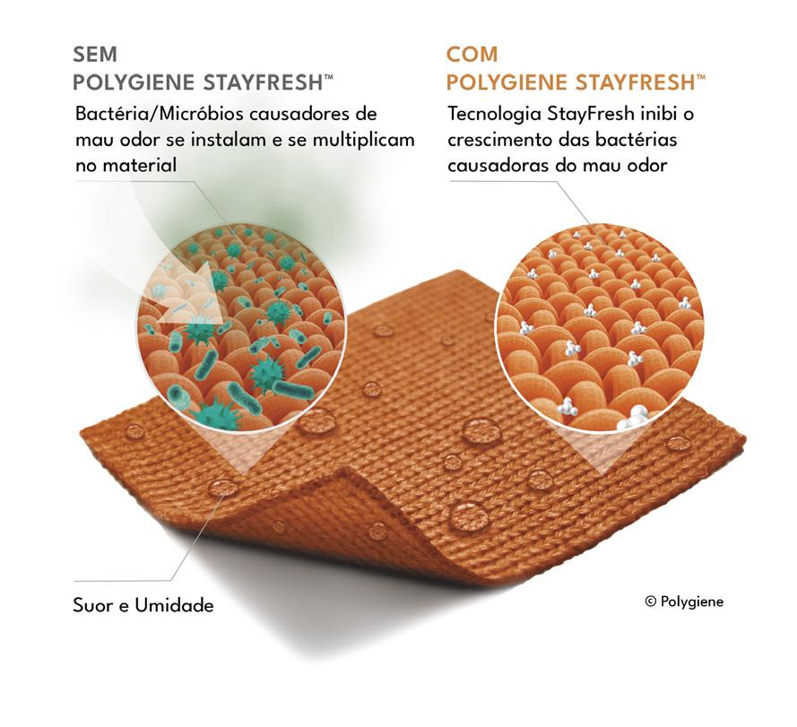 Polygiene StayFresh inibe o crescimento de bactérias causadoras de odor, impedindo os odores na fonte.
