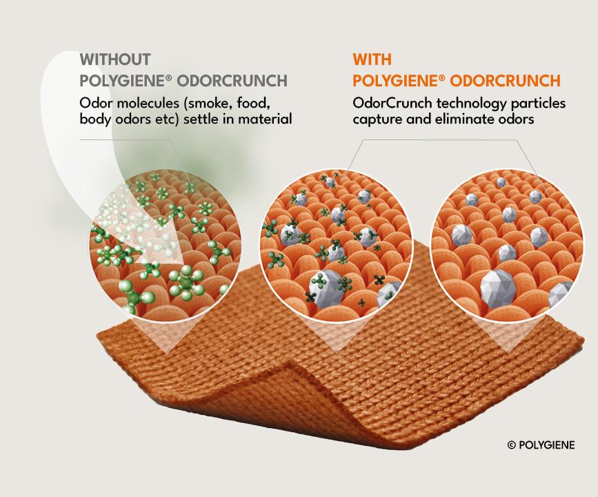A tecnologia de controle de odor Polygiene OdorCrunch é uma solução prática e ecologicamente correta para os problemas de odores persistentes em roupas e tecidos. Odores de fumaça, gordura de comida e outros cheiros do corpo ficam impregnados nas fibras dos tecidos. O Polygiene OdorCrunch funciona como um tratamento natural anti-odor, capturando, “triturando” e eliminando permanentemente os odores usando partículas naturais de sílica, o principal componente da areia comum. Isso não apenas mantém as roupas e os tecidos com um cheiro mais fresco por mais tempo, mas também reduz a quantidade de lavagem necessária. Isso reduz o uso de água e a quantidade de detergente e energia gastos na lavagem de roupas. Isso faz com que os tecidos durem mais, criando roupas ecologicamente corretas.