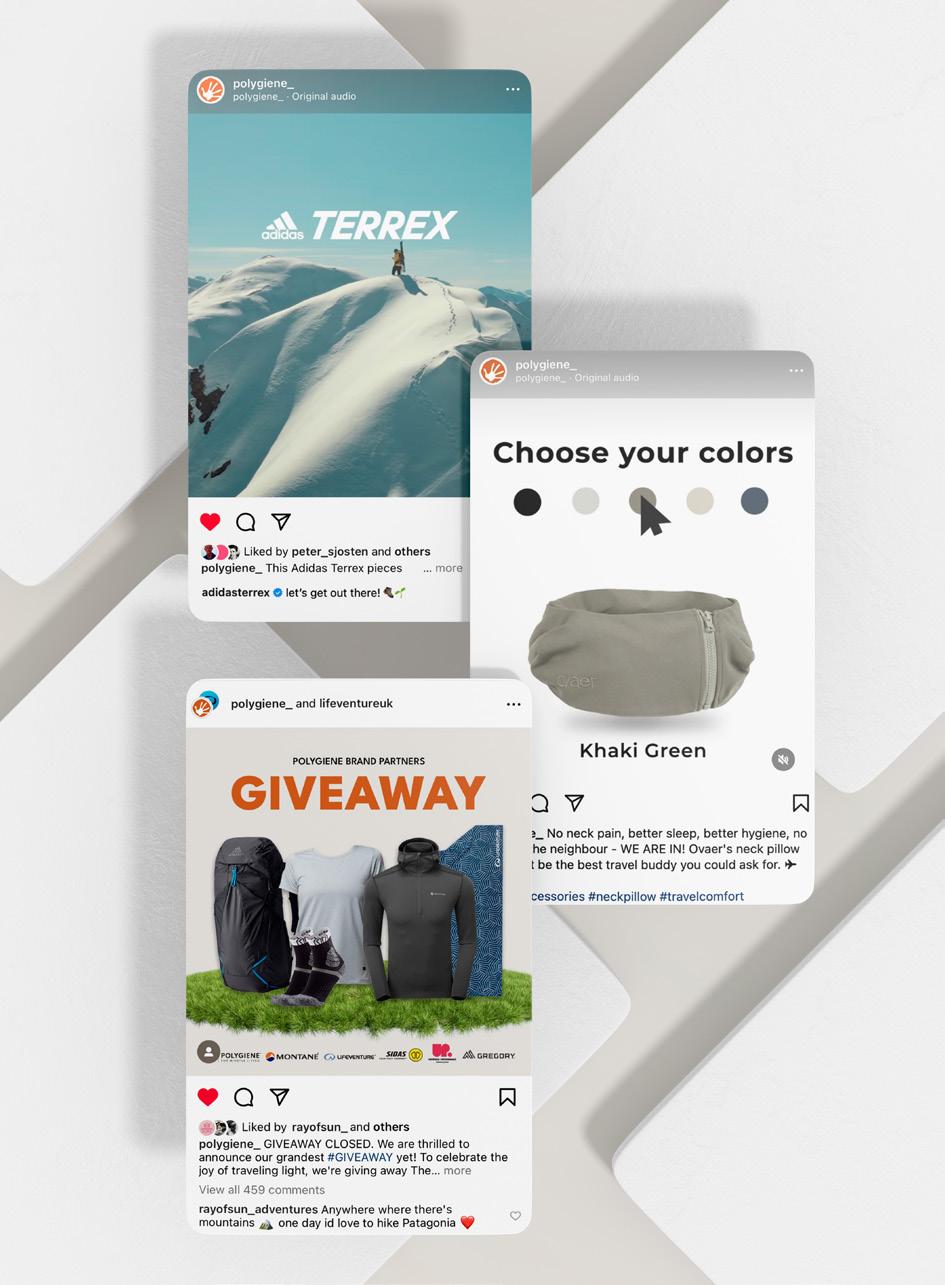 We often leverage our own established and extensive PR and marketing channels to promote Polygiene-treated products, providing access to an audience with a clear interest in sustainable technology and more eco-friendly consumer products. From regular Polygiene newsletters and customer case studies to our welldeveloped social media presence, we regularly collaborate with brands to ensure they receive maximum exposure. This includes campaigns for our partners’ new collections, as well as materials for important calendar events and celebrations. We also work with our partners’ in-house and third-party PR teams to guarantee consistent value-add messaging.