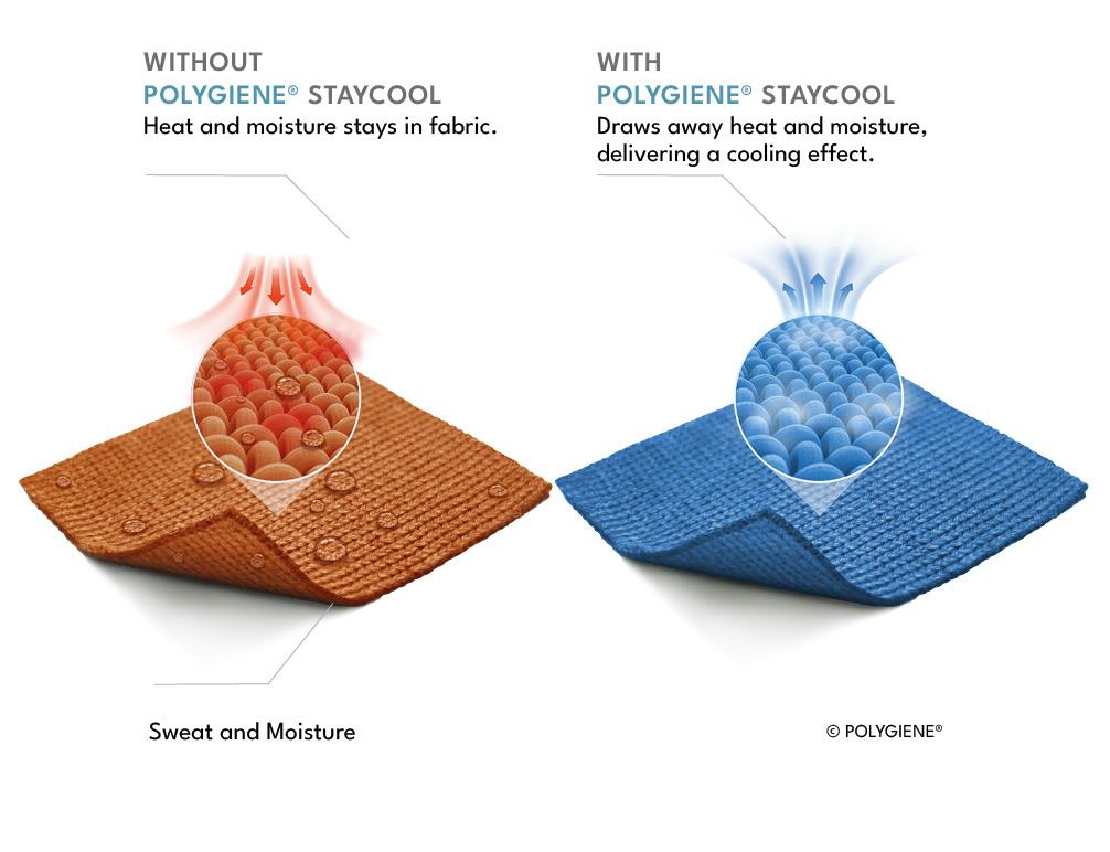 Our bodies naturally regulate temperature through evaporation, but traditional fabrics can trap heat and moisture, leading to discomfort. Polygiene StayCool enhances the cooling process by actively transporting the moisture away from the body allowing it to evaporate, whilst creating a refreshing sensation on contact.