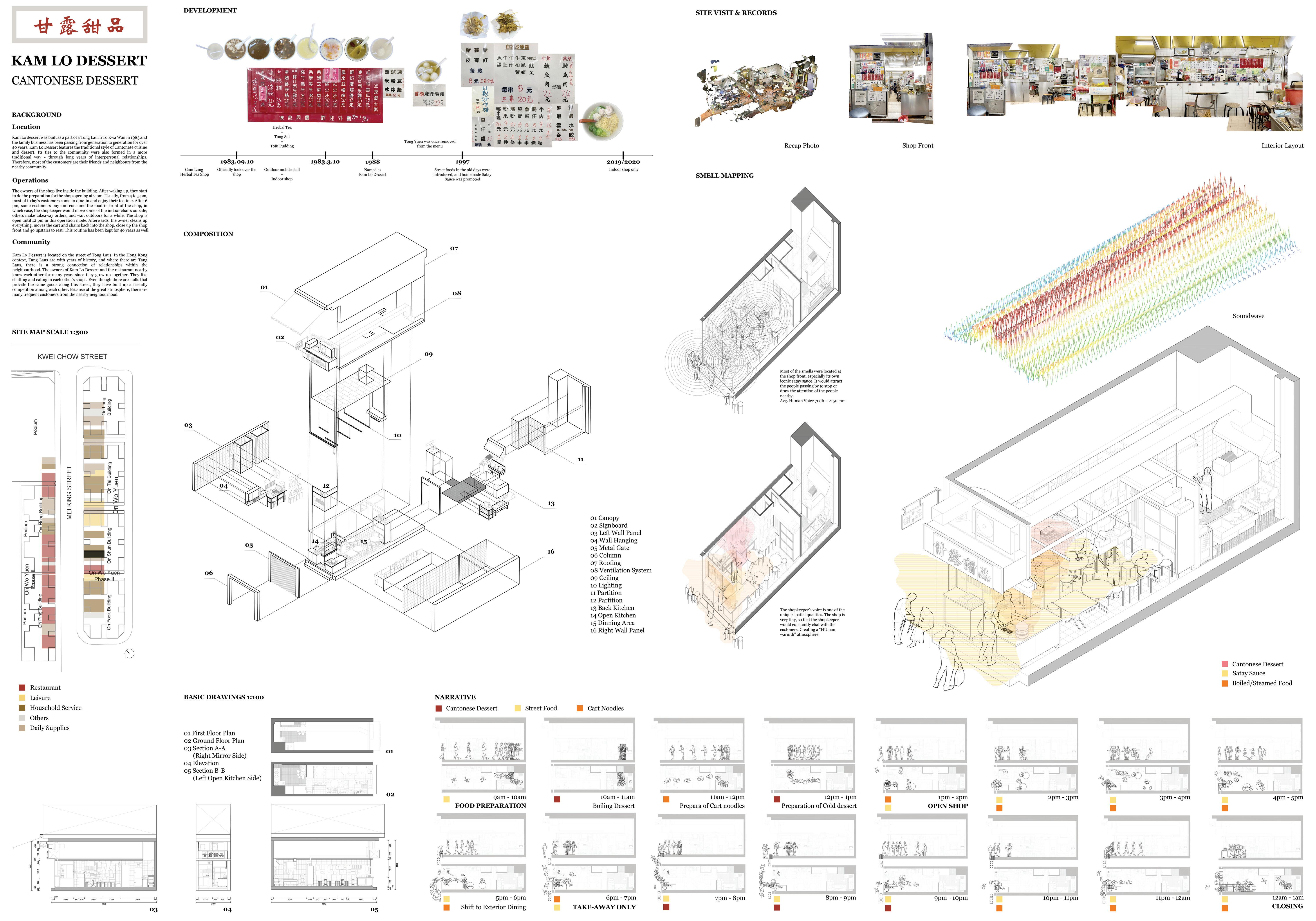 The translation of one restaurant typology into a two-dimensional plan drawing including various layers of historical, technical, material, narrative and related information all in one synoptic overview. This includes the execution of relevant research on one cuisine category/ restaurant typology in Hong Kong; and enhance digital skills using CAD