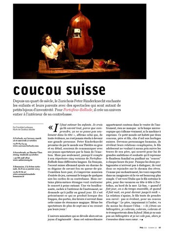 appartement contenu dans le ventre de l’instrument, rien ne manque : ni la lampe microscopique qui s’allume vraiment, ni la machine à expresso. Ce petit monde est habité par deux coucous, père et fils, clin d’œil aux horloges suisses. Devenus personnages humains, ils révèlent leurs relations compliquées, le fils adolescent ne voulant à aucun prix suivre les traces de son père, qui nourrit pour lui de grandes ambitions et souhaite qu’il reprenne le flambeau familial en piaillant un “coucou” à chaque heure du jour. Puisque les deux protagonistes n’arrivent pas à dialoguer, ils vont donc se rejoindre sur le chemin des rêves. Comme par enchantement, les voici emportés dans un imaginaire où la vie est beaucoup plus simple. C’est vers l’Italie que le fils entraîne le père, pour des vacances en tête-à-tête à Portofino, au bord de la mer. Là-bas, « quand il fait jour, on a du temps ensemble, et quand il fait nuit, on peut dormir jusqu’à midi ». La relation s’apaise, le fils tente de prendre son envol : pas si évident, pour un coucou d’horloge ! Le père, impuissant à l’aider, va du moins lui donner l’élan : « Si j’étais un hélicoptère, je volerais, volerais, volerais et te transporterais dans le fond. Mais je ne suis pas un hélicoptère et je ne vole pas, alors je t’emmène dans mon cœur. » Poly 152 Octobre 12