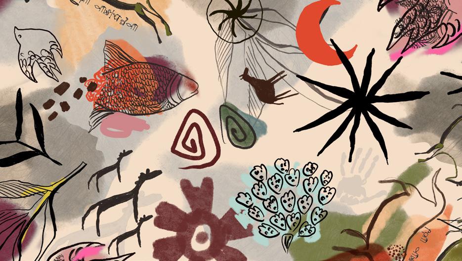 Where ancient tales meet fantasy. In simplistic drawings, murals from antiquity intertwine with the dreamy contours of Miró's art. This forms an eclectic interplay of animals and elements of nature.