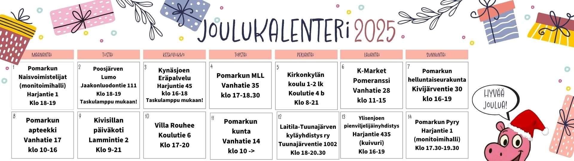 Kunkinpäivänluukunsisältöonyllätysjaseselviäävastapaikanpäällä!Joulukalenterintarkoituksenaontuodailoa, joulumieltäjapieniäyllätyksiäarjenkiireidenkeskelle.Paikanpäälläonopastus,jokajohdattaasinutpäivänluukulle.Huom!KalenterintiedotlöytyvätPomarkunkunnannettisivuiltaAjankohtaista-osiosta,tapahtumakalenteristasekäkunnanFacebook-sivulta.Paperiversiotaonsaatavillakunnanvirastonneuvonnastajakirjastosta.Tervetuloakurkistamaanjoulukalenterinluukkuja.