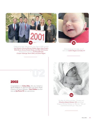 ’02 2002 Congratulations to Colton Riley, who was married to Rachel Mulkerin on April 30, 2016 at St. James Parish Church in St. James, Barbados. Chris Watkins was best man and Jay Powers ’03 was a groomsman.
