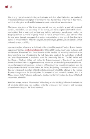 Through education and intervention, Pomfret School makes every effort to achieve a learning, teaching, and living environment that is free from abuse, bullying, harassment, hazing or discrimination. The School uses its Conduct and Compliance Team (CCT) to ensure the safety of all members of the community, including students and employees.