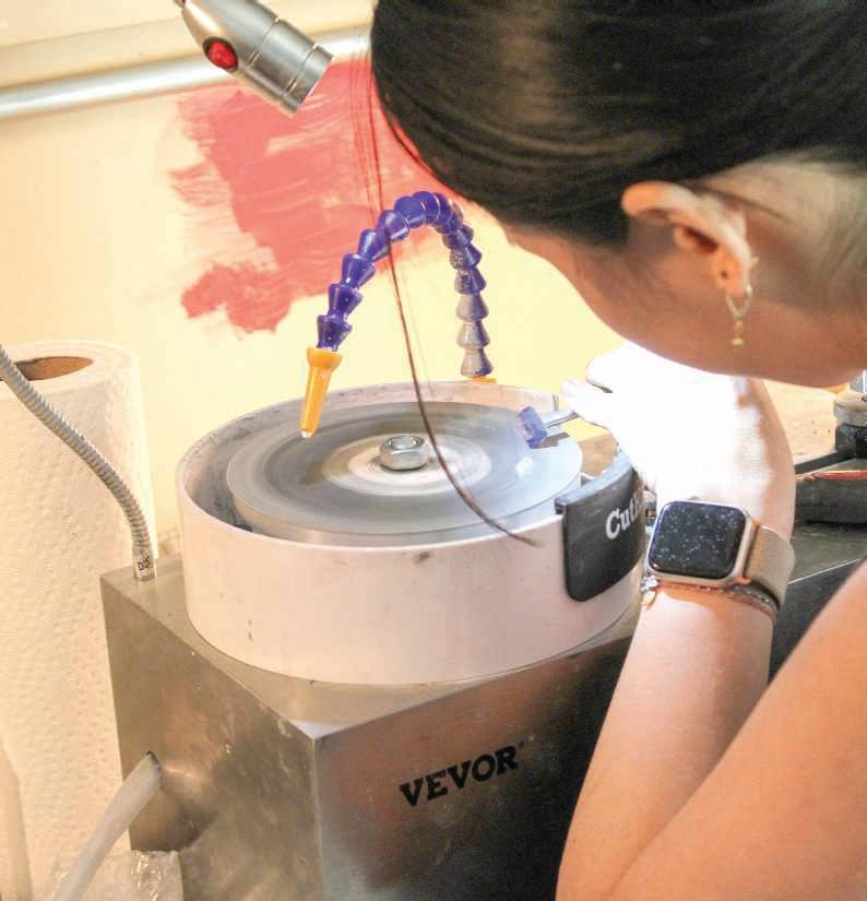 This fall, Gray pursued lapidary as her independent study. She purchased a beginner faceting machine and spent hours in the loft of Chick Cole Studio, learning both basic and advanced cuts. Her study extended beyond the studio, exploring natural and lab-grown crystals, as well as stones engineered for industrial use, including synthetic sapphire used in fighter jets.