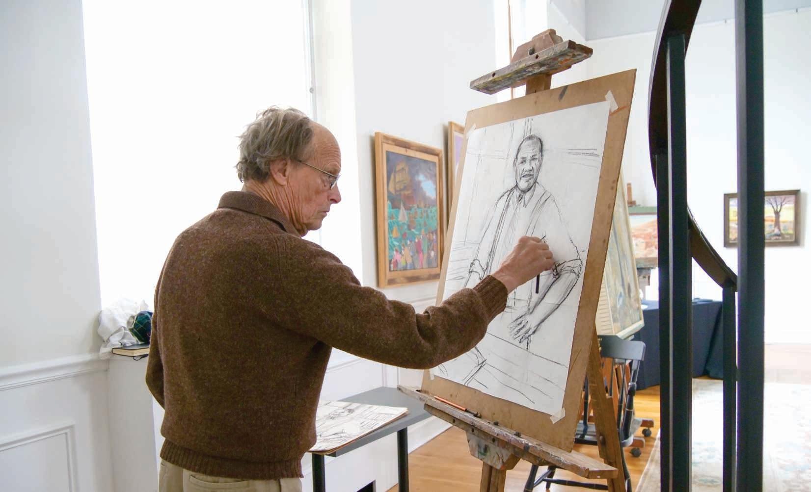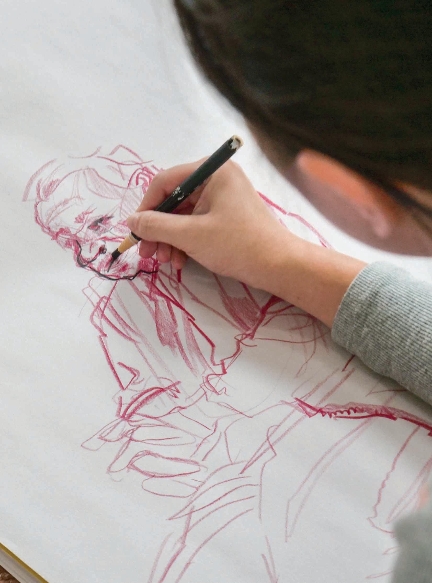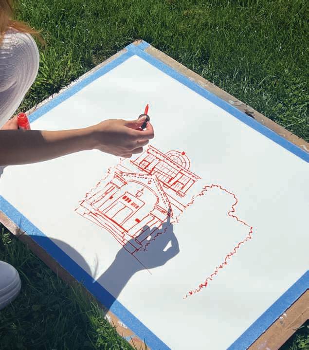 Armed with charcoal and sketch pads, students spread out across the Chapel Lawn and patio, observing the details of the treasured Clark Memorial Chapel. Their drawings captured the texture of the stone walls hidden beneath creeping ivy, the intricate carvings and ironwork of the heavy wooden doors, and the graceful arch framing the entrance.