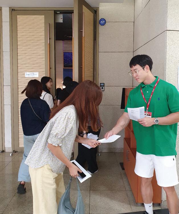 오후 1시 40분, 3부 예배가 끝나고 청년예배가 조금씩 준비되는 시간입니다. 그 가운데 예배를 드리기 위해 오는 청년들을 가장 앞에서 환영하고 맞이하는 사람들이 있습니다. 바로 예배지원팀입니다.