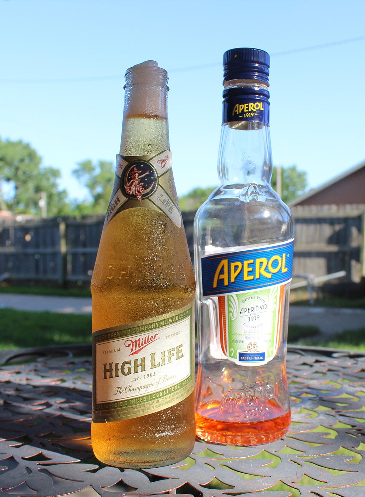 I know, it sounds a little unhinged. But listen, it’s light; it’s fruity; it’s got that slight bitterness that Aperol brings to the party; and the lemon adds a tart kick that keeps your taste buds dancing. Plus, you’ve got the champagne of beers, Miller High Life.