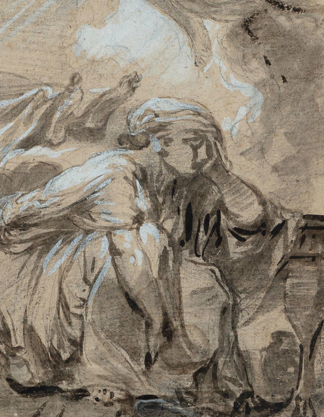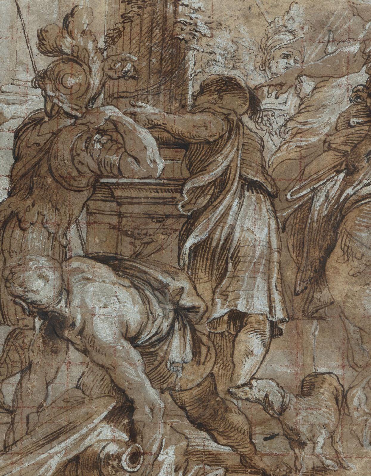 Our drawing is a precious witness to the creative process in the workshop of the Master of Urbino: it is executed after a design by Raphaël through Penni’s prism. One of Raphael’s first pupils was Gianfrancesco Penni, whose role in the industrious workshop was primarily that of executant of the master’s designs, both frescoes and panel paintings. He entered the workshop in 1511 and received the nickname Il Fattore. His nickname suggests an administrative role in Raphael’s workshop. Vasari reports that Penni’s specialty consisted in the production of finished drawings after Raphael’s creations, not facilitating the reconstruction of his work which remains hypothetical. However, a group of drawings produced in the Master’s workshop has enough common points to attribute them to his hand and define the characteristics of his draughtsmanship. They also tell us about his role within the studio, as well as his degree of assimilation of the graphic precepts of Raphaël.