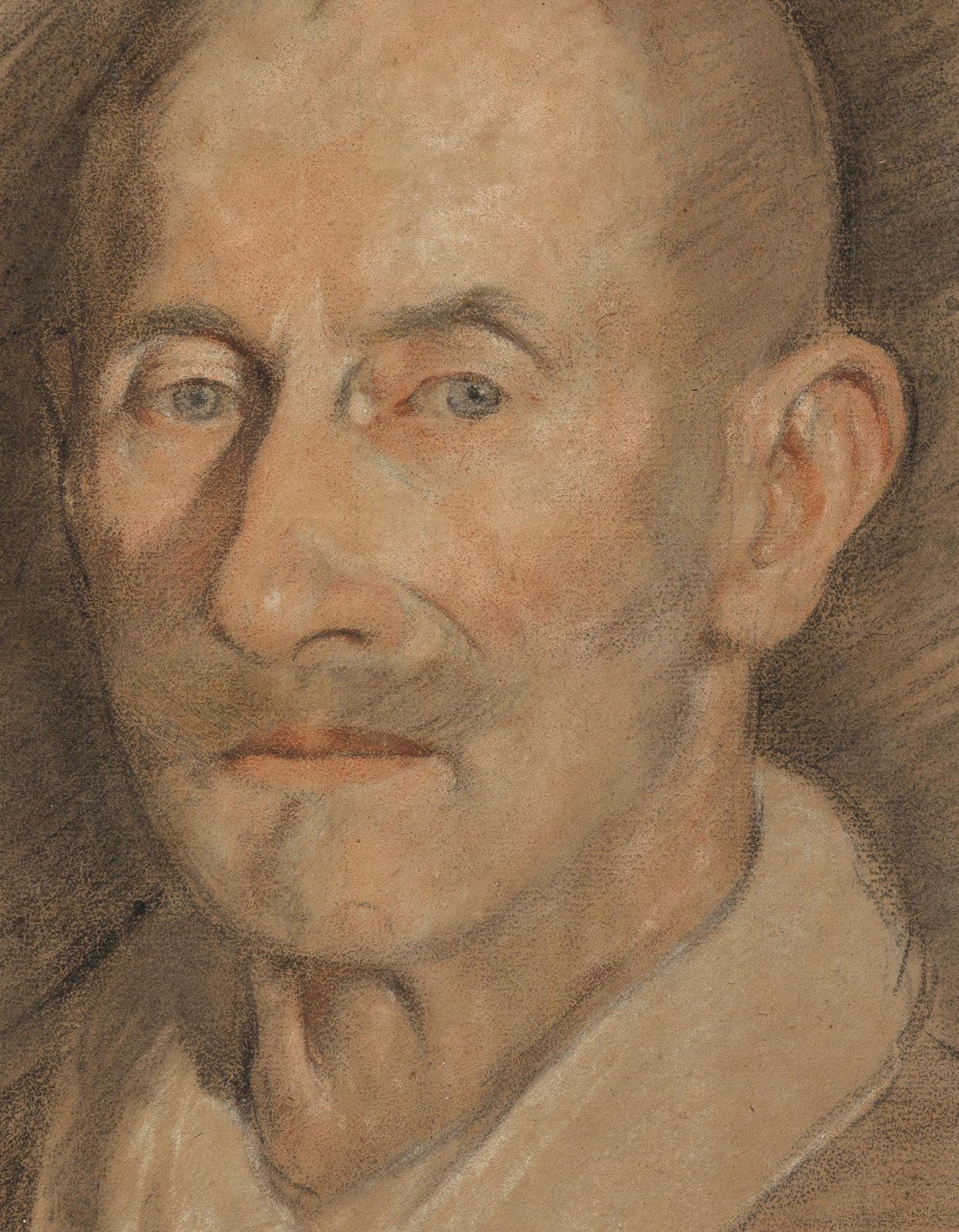 Vu comme l’un des grands peintres décorateurs du XVIII e siècle en Europe, Giovanni Battista Tiepolo (1696–1770) est né à Venise dans la famille d’un petit armateur. Notre dessin à la pierre noire démontre également une main remarquable en ce qui concerne le portrait. Tiepolo a dessiné le buste de face, légèrement tourné vers la gauche. Les études de têtes comptent parmi ses œuvres graphiques les plus expressives et les plus abouties.
