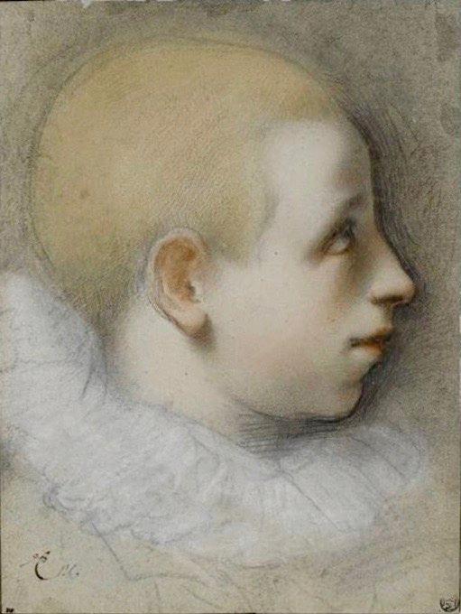 Une étude de tête de jeune garçon , la joue dans sa main droite , également réalisée sur papier bleu à la sanguine rehaussée de blanc (27,3 x 19,7 cm, Bonhams New York, 29 octobre 2010, lot 1) révèle un style homogène avec notre feuille. Toutes deux ont l’immédiateté et la vitalité des études faites sur le vif. Plus particulièrement, la main droite du jeune garçon montre un traitement comparable au notre ; le modelé obtenu par de fines hachures avec des rehauts de blanc qui accrochent la lumière.