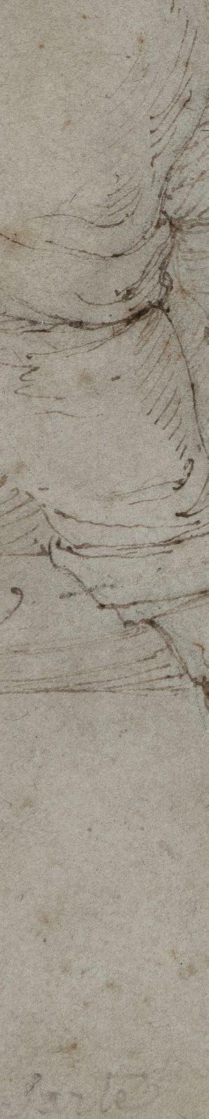 Exécutée à la plume et à l’encre, la feuille est ici présentée comme une œuvre de Timoteo della Vite en raison d’étroites similitudes avec ses dessins datant de la fin du XVe siècle, alors que le nom de Raphaël, à qui le dessin a été donné dans le passé, tel qu’il fut inventorié par la famille Antaldi, apparaît dans l’inscription en bas à gauche (“ R.[aphael] V[rbinas] ”). Les comparaisons incluent l’esquisse de Viti du Miracle de la vache démoniaque , plume et encre brune, 26,5 x 40,9 cm, inv. N.1458, Albertina, Vienne ; dans laquelle le nu masculin à gauche de la composition fait indéniablement écho à notre étude de femme ; ainsi que l’Etude pour une Crucifixion, vers 1504-1509, plume et encre brune, 31,9 x 21,1 cm, Inv. MTC 5051, provenance: Comte Etienne- Marie de Saint Genys (1856-1915); legs Saint-Genys à la Ville d’Angers, Février 1917, Musée d’Angers (ci-contre). C’est à Viti que Philip Pouncey a rendu en 1977-1978 cette saisissante variation autour du thème de la Crucifixion qui daterait de la période où l’artiste collabore avec Genga. Le style de notre croquis est proche de celui des nus masculins affairés au pied de la croix du Larron de gauche, dans lesquels on retrouve l’usage systématique de petites hachures parallèles pour suggérer les ombres. D’autres analogies avec la manière de l’artiste se retrouvent également dans deux études de nus conservées à l’Ecole des Beaux Arts de Paris: Nu masculin debout, pierre noire, 34,3 x 14,2 cm, N° 433 et Etude de femme nue, debout, vue de dos, et étude d’homme vu de profil, pierre noire, 32,4 x 19 cm, N° 432.