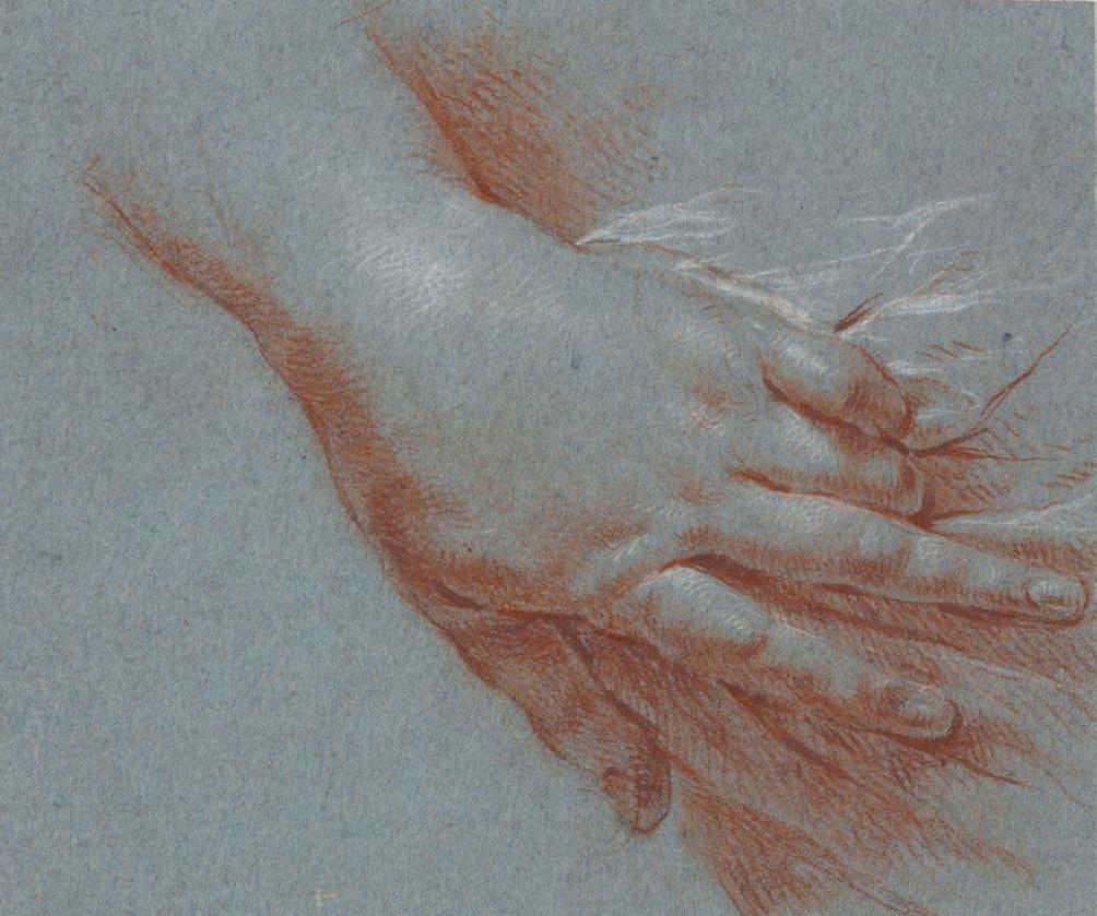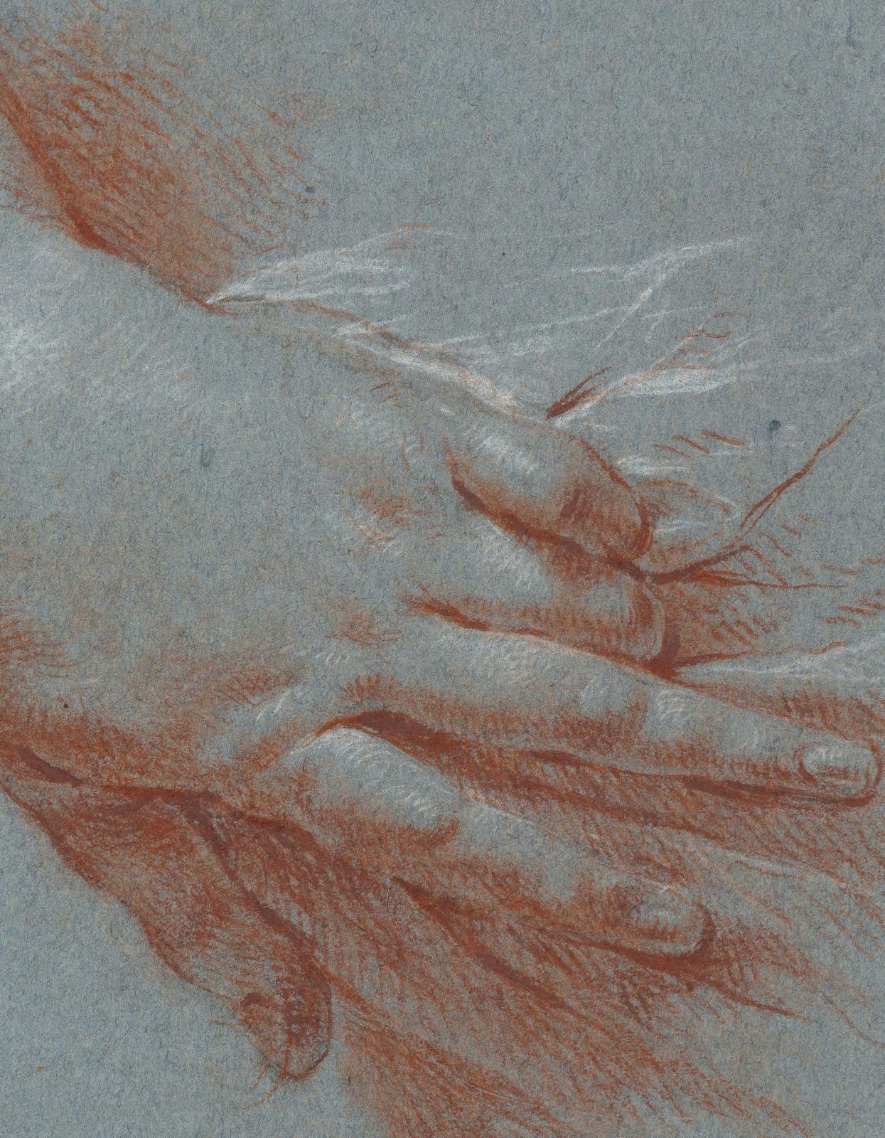 This beautiful hand study, in red chalk heightened with white on blue paper, his favorite media, is characteristic of Tiepolo’s drawn work. In this right-hand preparatory drawing of Venus in Venus and Vulcan , Museum of Art in Philadelphia, the artist quickly sketches his ideas while making a brilliant study of detail. Only the position of the middle finger in the painting differs. The use of red chalk by Giovanni Battista is particularly virtuoso here: the modeling of the hand is suggested by many subtle details which create a lively and realistic rendering.