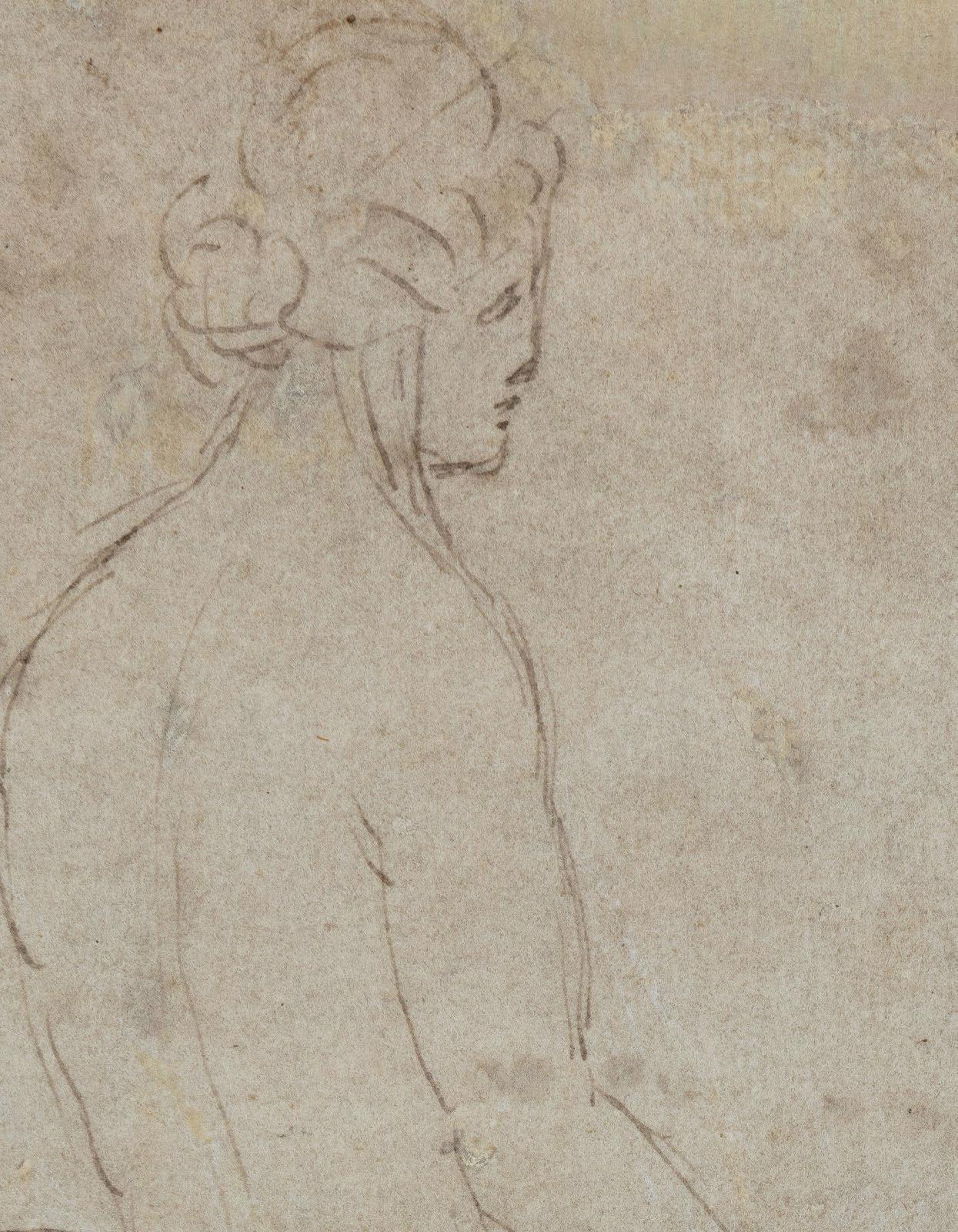 This sheet seems to relate to a work by Bugiardini in the Kunsthistorisches Museum in Vienna, The Rape of Dinah, and seems to be a preparatory sketch for the figure on the far left of the painting. The latter has her head slightly turned and tilted to the right, and wears a simple headdress like our model. Only the eyes differ, which are no longer lowered.