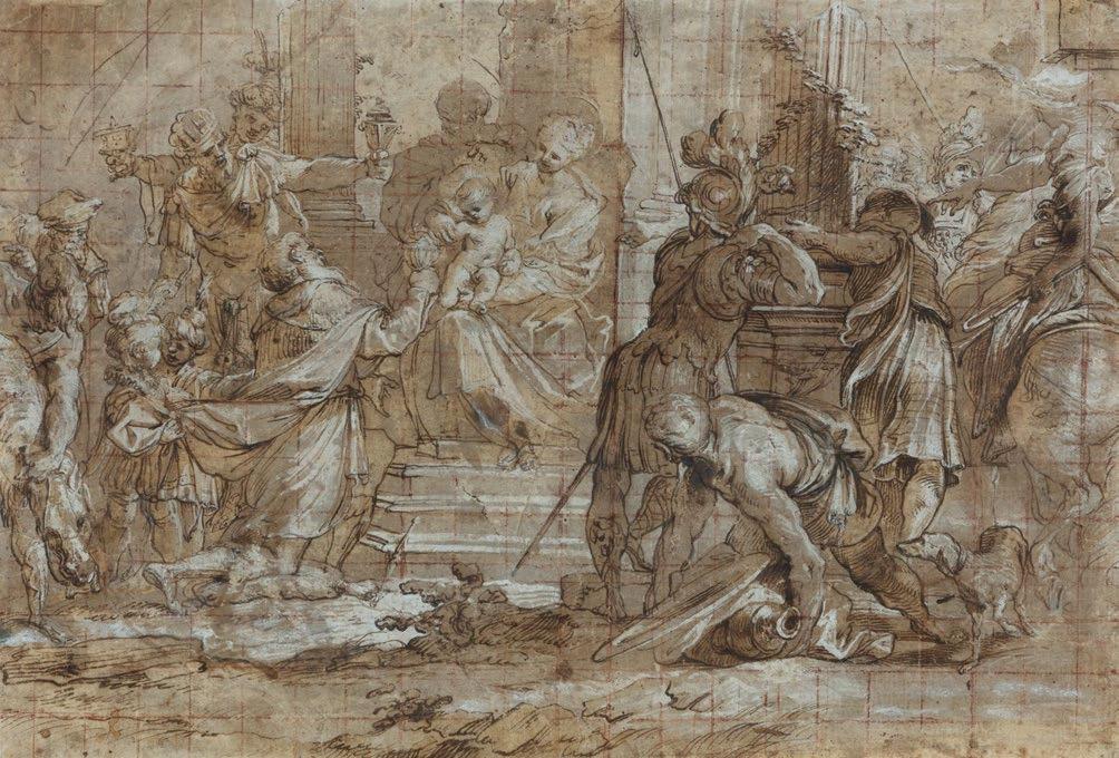 Notre dessin est un précieux témoin du processus créatif de l’atelier du Maître d’Urbino puisqu’il est exécuté d’après une création de Raphaël à travers le prisme de Penni. L’un des premiers élèves de Raphaël fut Gianfrancesco Penni, dont le rôle dans l’atelier très actif du Maître était principalement celui d’exécuteur des dessins du maître, à la fois des fresques et des peintures sur panneaux. Il entra dans l’atelier en 1511 et reçut le surnom Il Fattore . Vasari rapporte que la spécialité de Penni consistait en la production de dessins finis d’après les créations de Raphaël, ne facilitant pas la reconstitution de son oeuvre qui demeure hypothétique. Toutefois un groupe de dessins produits dans l’atelier du Maître présente suffisamment de points communs permettant de les assigner à sa main et de définir les caractéristiques de son graphisme. Ils nous renseignent également sur son rôle au sein de l’atelier, comme de son degré d’assimilation des préceptes graphiques de Raphaël.