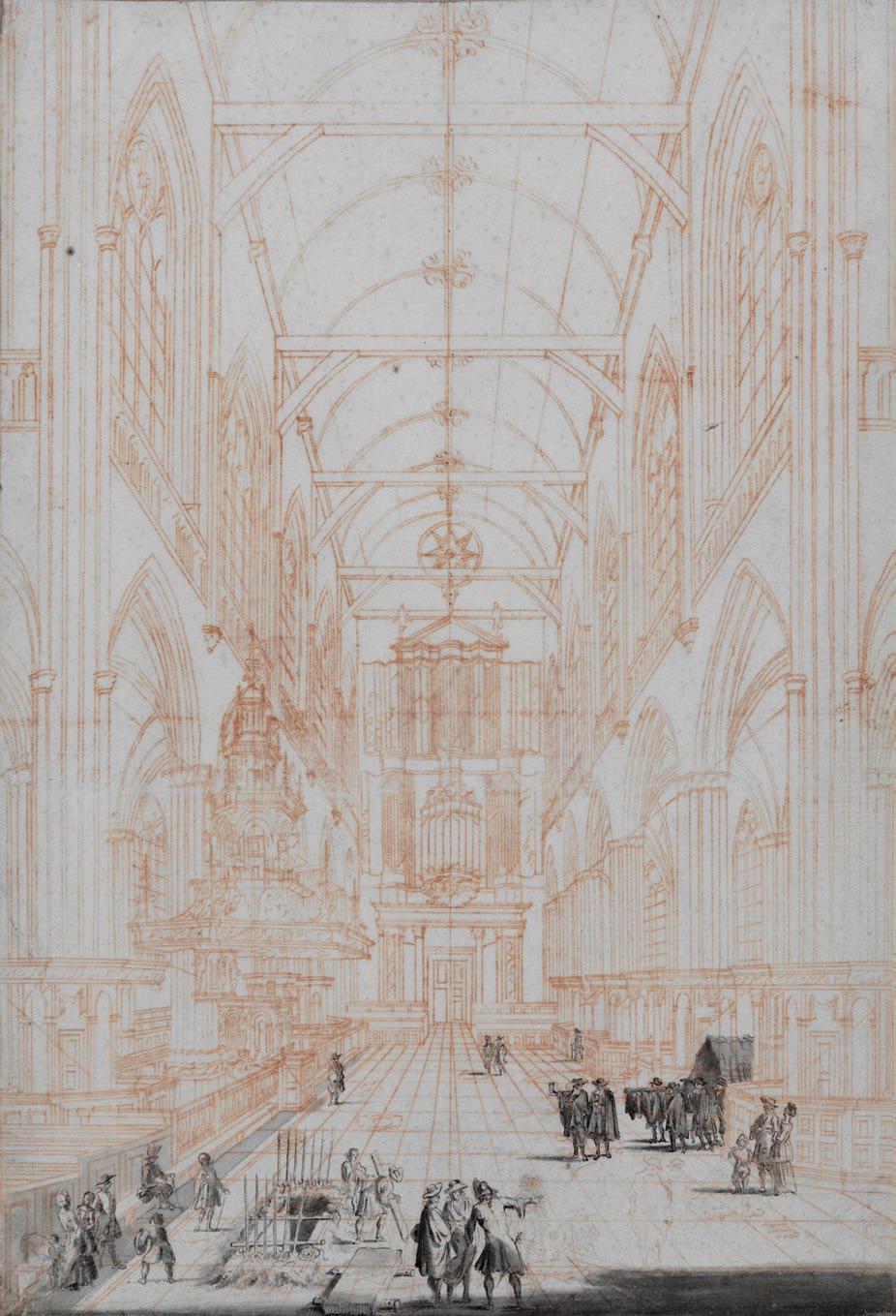 • Jan Goeree et Bernard Picart, Vue de l’intérieur de l’Oude Kerk à Amsterdam, regardant vers l’ouest vers l’orgue, contre-épreuve à la sanguine, à la plume et encre noire et lavis gris, 23,5 x 17,5 cm, Victoria & Albert museum , D.379-1887