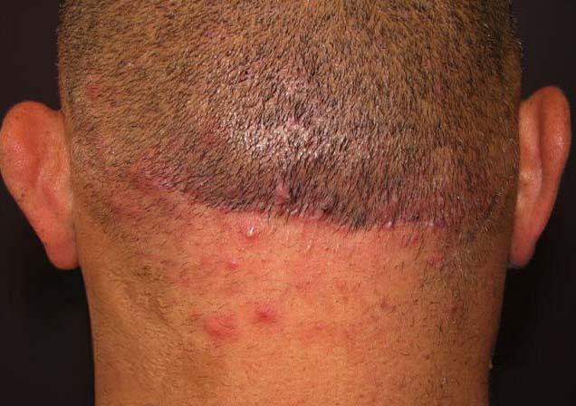 Folliculitis is typified by pustules appearing around hair follicles. Any papules or pustules associated with scabies often occur on non-hair bearing skin.