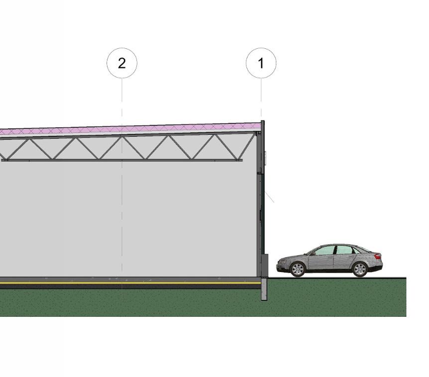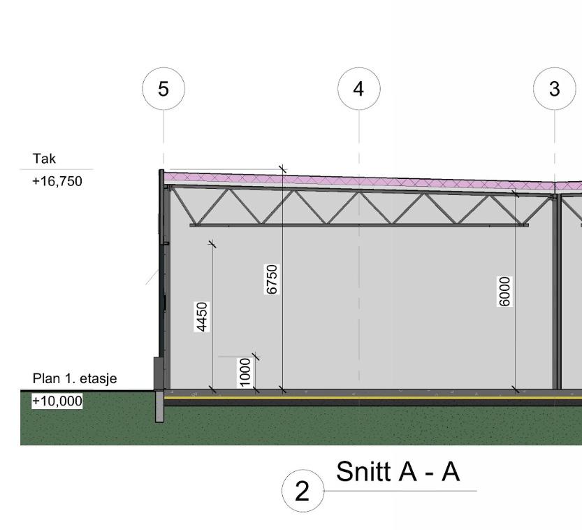 Brystning av isolerte betongelementer ca. 1 m over gulv. Taket er konstruert med selv bærende takplater i stål. Ytter- og inner vegger i isolerte sandwichelementer.