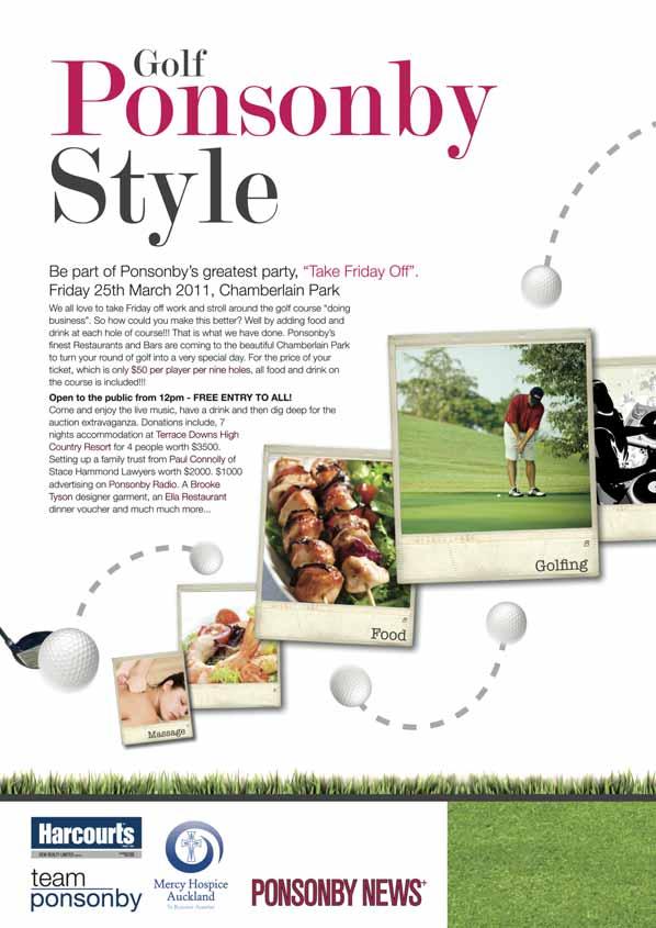 BE PART OF PONSONBY’S GREATEST PARTY ‘TAKE FRIDAY OFF’ ON FRIDAY, 25 March at the beautiful Chamberlain Park, Western Springs. We all love to take Friday off work and stroll around the golf course ‘doing business’. Ponsonby’s finest restaurants and bars are coming as well to turn your round of golf into a very special day. For the price of your ticket, which is only $50 per player, per nine holes, all food and drink on the course is included.