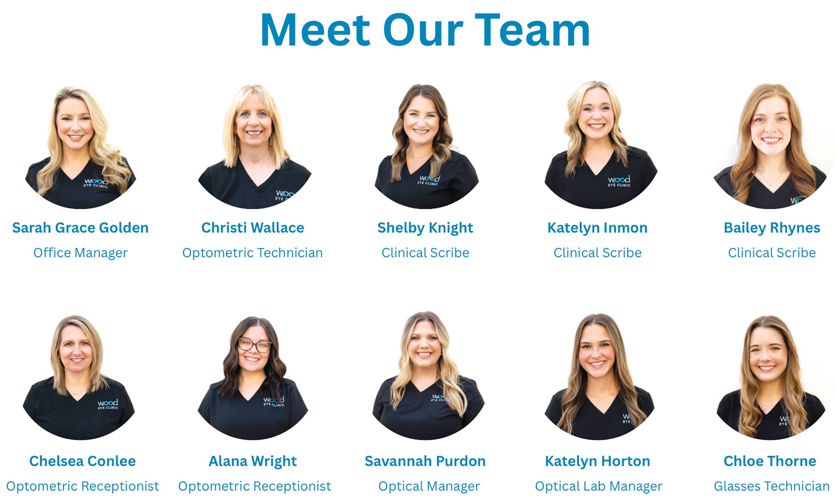Each doctor is supported by skilled medical scribes, Katelyn Inmon, Shelby Knight, and Bailey Rynes, who help ensure thorough and efficient patient care. In the optical area, Savannah Moore serves as the clinic’s optical technician, helping patients find eyewear that fits their vision needs and personal style, making everyone feel special in their new glasses.