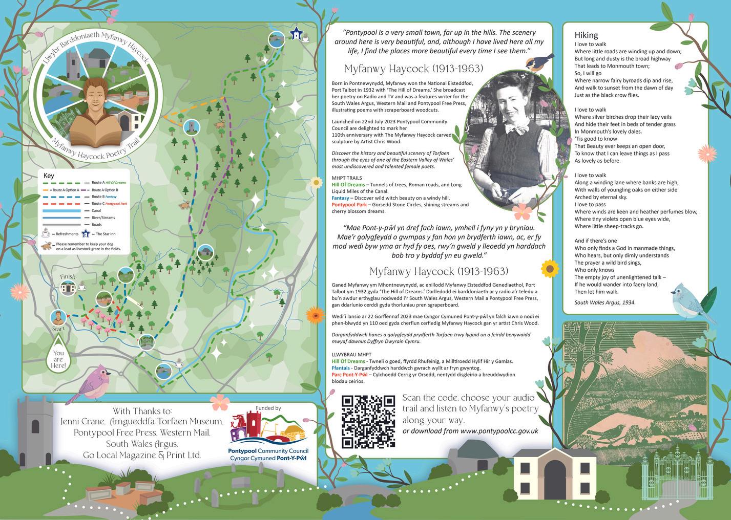 In July 2023, in collaboration with broadcaster Jenni Crane, Pontypool Community Council launched the brand new Myfanwy Haycock Poetry Trail – a series of walking routes starting from Pontypool Park, accompanied by an interactive walking app that is free to download