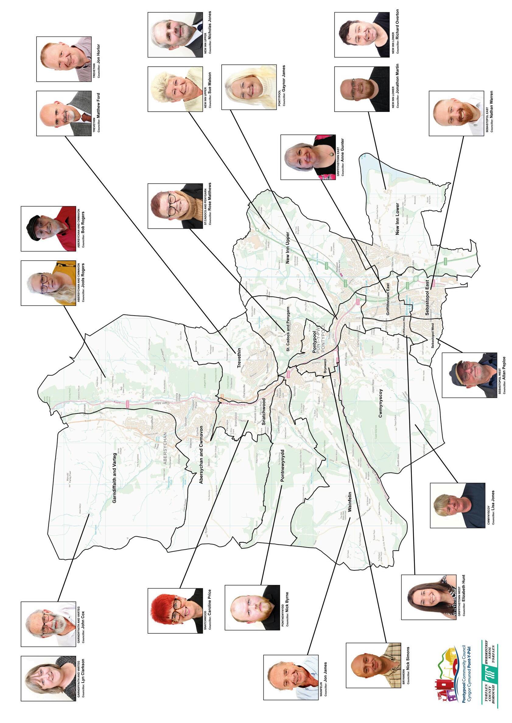 The wards the elected members cover are as follows: Abersychan and Cwmavon, Brynwern, Cwmynyscoy, Garndiffaith & Varteg, Griffithstown East and West, New Inn Lower, New Inn Upper, Pontnewynydd, Pontypool, Sebastopol East and West, Snatchwood, St. Cadocs & Penygarn, Wainfelin and Trevethin. Each Councillor and the ward that they represent is shown on the next page
