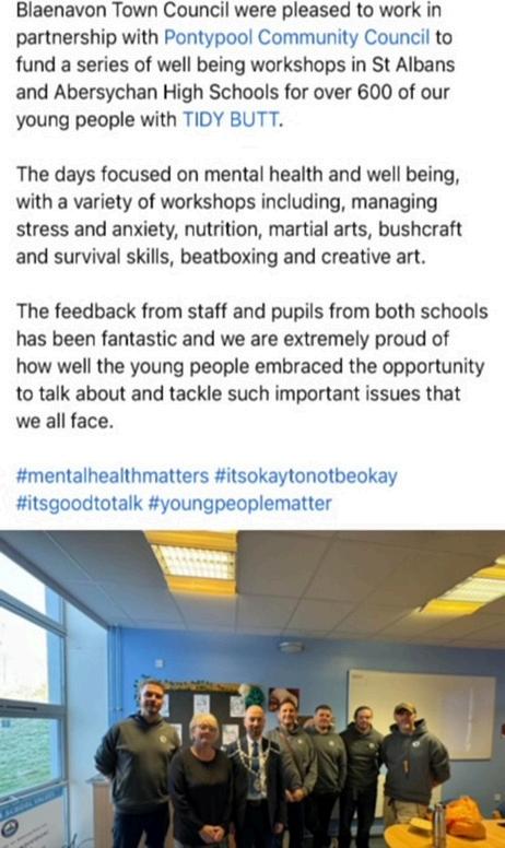 Pontypool Community Council were pleased to work in partnership with Blaenavon Town Council to fund a series of well-being workshops in St Albans RC and Abersychan High Schools. We also fully funded a workshop at West Mon High School. In total we worked with over 600 of our young people. This was one of the social media posts about this campaign.